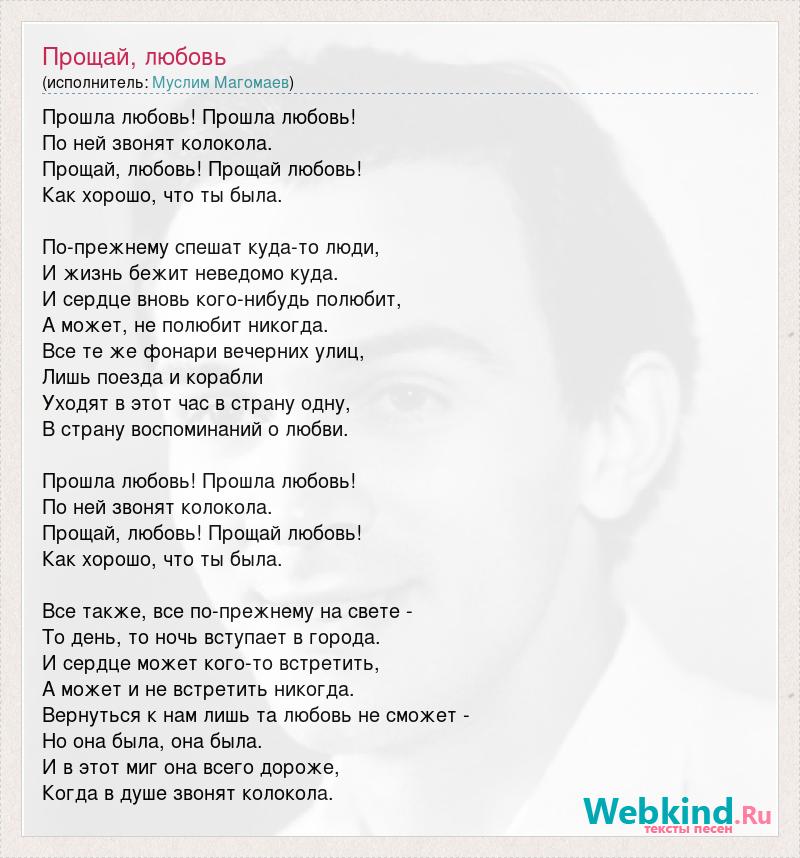 Прошла любовь! Прошла любовь! По ней звонят колокола. Прощай, любовь! Прощай любовь! Как хорошо, что ты была. По-прежнему спешат куда-то люди, И жизнь бежит неведомо куда. И сердце вновь кого-нибудь полюбит, А может, не полюбит никогда. Все те же фонари вечерних улиц, Лишь поезда и корабли Уходят в этот час в страну одну, В страну воспоминаний о любви. Прошла любовь! Прошла любовь! По ней звонят колокола. Прощай, любовь! Прощай любовь! Как хорошо, что ты была. Все также, все по-прежнему на свете - То день, то ночь вступает в города. И сердце может кого-то встретить, А может и не встретить никогда. Вернуться к нам лишь та любовь не сможет - Но она была, она была. И в этот миг она всего дороже, Когда в душе звонят колокола.