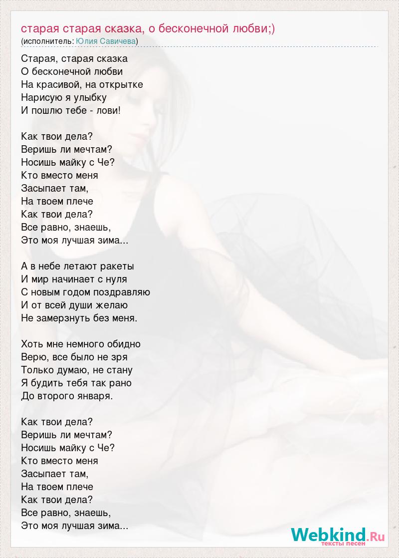 Старая, старая сказка О бесконечной любви На красивой, на открытке Нарисую я улыбку И пошлю тебе - лови! Как твои дела? Веришь ли мечтам? Носишь майку с Че? Кто вместо меня Засыпает там, На твоем плече Как твои дела? Все равно, знаешь, Это моя лучшая зима... А в небе летают ракеты И мир начинает с нуля С новым годом поздравляю И от всей души желаю Не замерзнуть без меня. Хоть мне немного обидно Верю, все было не зря Только думаю, не стану Я будить тебя так рано До второго января. Как твои дела? Веришь ли мечтам? Носишь майку с Че? Кто вместо меня Засыпает там, На твоем плече Как твои дела? Все равно, знаешь, Это моя лучшая зима...