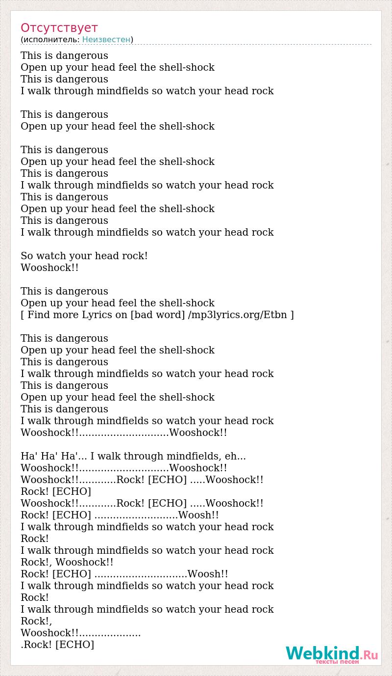 This is dangerous Open up your head feel the shell-shock This is dangerous I walk through mindfields so watch your head rock This is dangerous Open up your head feel the shell-shock This is dangerous Open up your head feel the shell-shock This is dangerous I walk through mindfields so watch your head rock This is dangerous Open up your head feel the shell-shock This is dangerous I walk through mindfields so watch your head rock So watch your head rock! Wooshock!! This is dangerous Open up your head feel the shell-shock [ Find more Lyrics on [bad word] /mp3lyrics.org/Etbn ] This is dangerous Open up your head feel the shell-shock This is dangerous I walk through mindfields so watch your head rock This is dangerous Open up your head feel the shell-shock This is dangerous I walk through mindfields so watch your head rock Wooshock!!.............................Wooshock!! Ha' Ha' Ha'... I walk through mindfields, eh... Wooshock!!.............................Wooshock!! Wooshock!!............Rock! [ECHO] .....Wooshock!! Rock! [ECHO] Wooshock!!............Rock! [ECHO] .....Wooshock!! Rock! [ECHO] ...........................Woosh!! I walk through mindfields so watch your head rock Rock! I walk through mindfields so watch your head rock Rock!, Wooshock!! Rock! [ECHO] ..............................Woosh!! I walk through mindfields so watch your head rock Rock! I walk through mindfields so watch your head rock Rock!, Wooshock!!.................... .Rock! [ECHO]