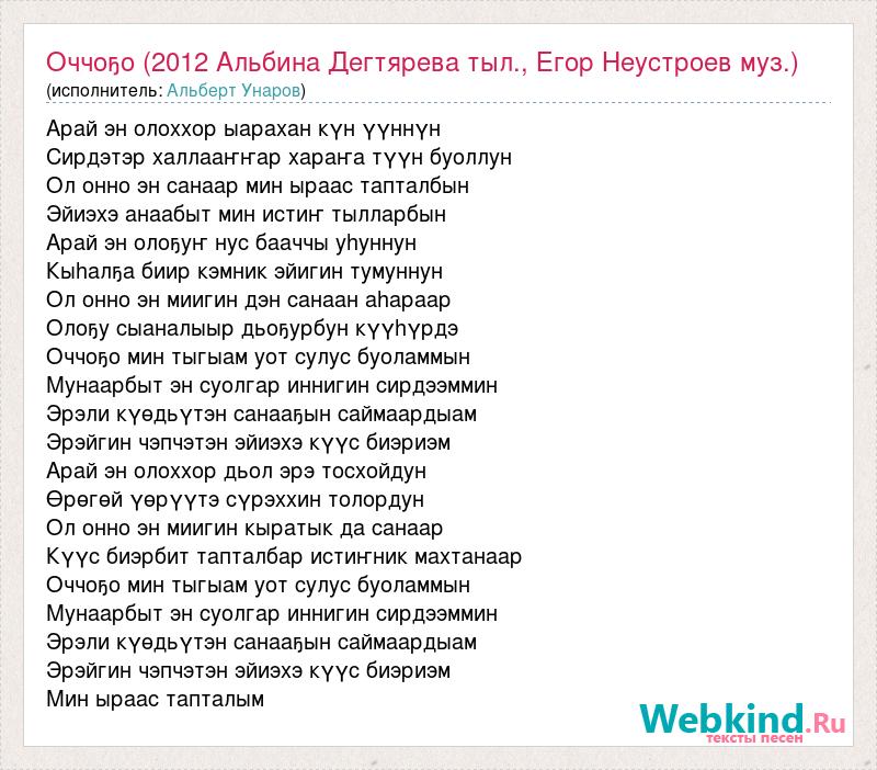 Арай эн олоххор ыарахан күн үүннүн Сирдэтэр халлааҥҥар хараҥа түүн буоллун Ол онно эн санаар мин ыраас тапталбын Эйиэхэ анаабыт мин истиҥ тылларбын Арай эн олоҕуҥ нус бааччы уhуннун Кыhалҕа биир кэмник эйигин тумуннун Ол онно эн миигин дэн санаан аhараар Олоҕу сыаналыыр дьоҕурбун күүhүрдэ Оччоҕо мин тыгыам уот сулус буоламмын Мунаарбыт эн суолгар иннигин сирдээммин Эрэли күөдьүтэн санааҕын саймаардыам Эрэйгин чэпчэтэн эйиэхэ күүс биэриэм Арай эн олоххор дьол эрэ тосхойдун Өрөгөй үөрүүтэ сүрэххин толордун Ол онно эн миигин кыратык да санаар Күүс биэрбит тапталбар истиҥник махтанаар Оччоҕо мин тыгыам уот сулус буоламмын Мунаарбыт эн суолгар иннигин сирдээммин Эрэли күөдьүтэн санааҕын саймаардыам Эрэйгин чэпчэтэн эйиэхэ күүс биэриэм Мин ыраас тапталым