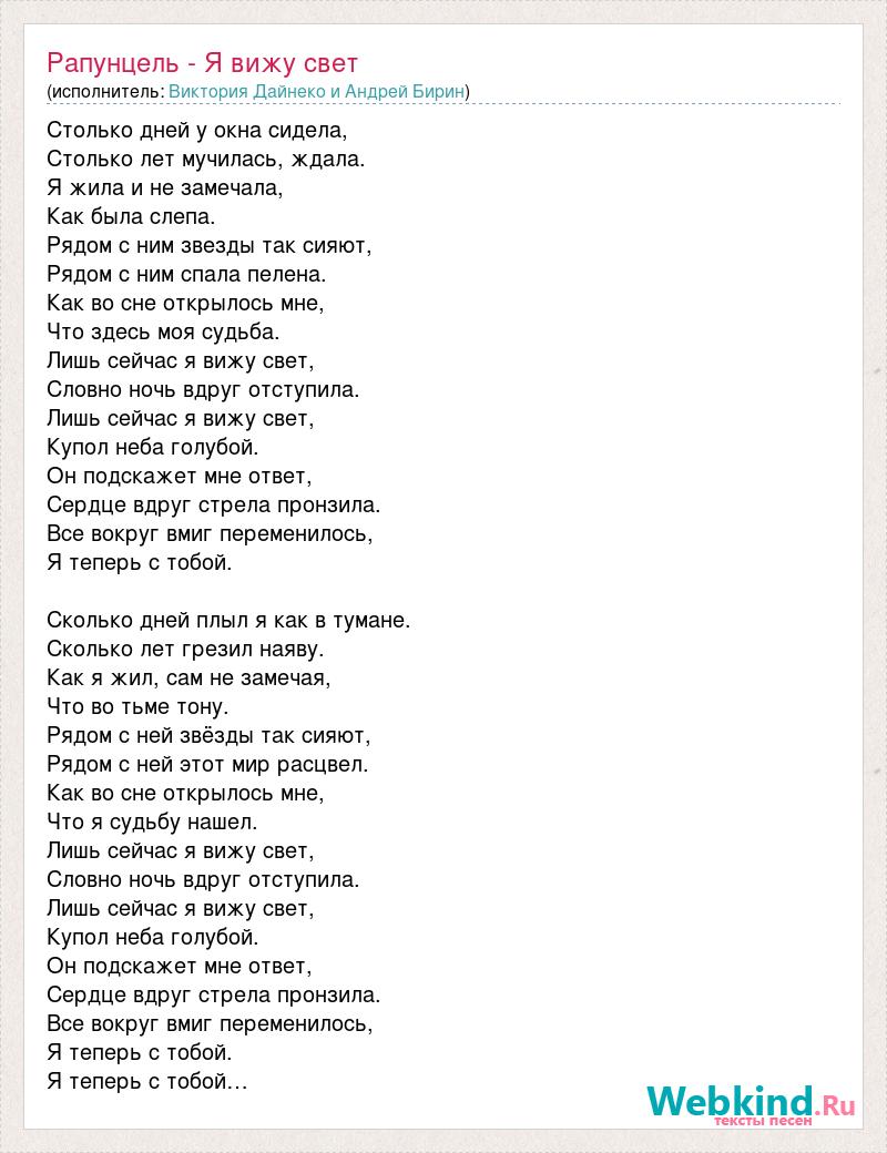 Столько дней у окна сидела, Столько лет мучилась, ждала. Я жила и не замечала, Как была слепа. Рядом с ним звезды так сияют, Рядом с ним спала пелена. Как во сне открылось мне, Что здесь моя судьба. Лишь сейчас я вижу свет, Словно ночь вдруг отступила. Лишь сейчас я вижу свет, Купол неба голубой. Он подскажет мне ответ, Сердце вдруг стрела пронзила. Все вокруг вмиг переменилось, Я теперь с тобой. Сколько дней плыл я как в тумане. Сколько лет грезил наяву. Как я жил, сам не замечая, Что во тьме тону. Рядом с ней звёзды так сияют, Рядом с ней этот мир расцвел. Как во сне открылось мне, Что я судьбу нашел. Лишь сейчас я вижу свет, Словно ночь вдруг отступила. Лишь сейчас я вижу свет, Купол неба голубой. Он подскажет мне ответ, Сердце вдруг стрела пронзила. Все вокруг вмиг переменилось, Я теперь с тобой. Я теперь с тобой…