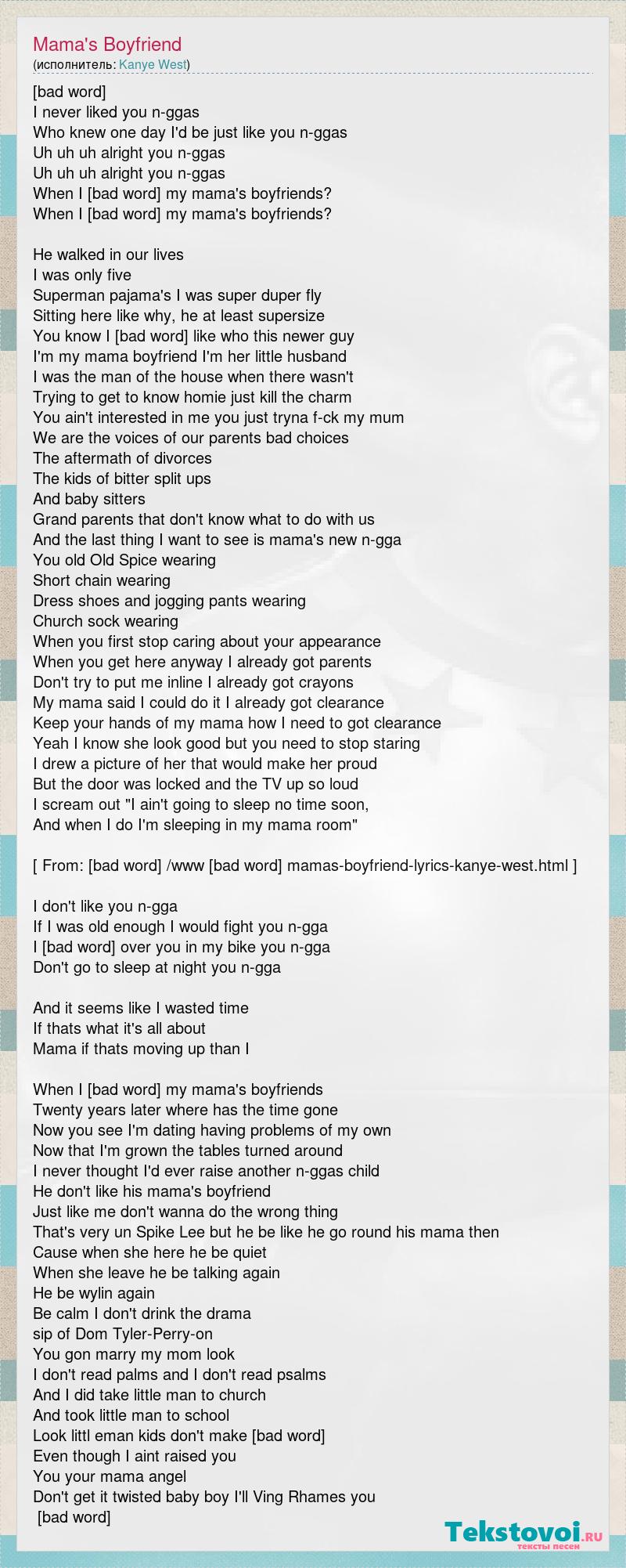 [Chorus] I never liked you n-ggas Who knew one day I'd be just like you n-ggas Uh uh uh alright you n-ggas Uh uh uh alright you n-ggas When I become my mama's boyfriends? When I become my mama's boyfriends? He walked in our lives I was only five Superman pajama's I was super duper fly Sitting here like why, he at least supersize You know I scrutinise like who this newer guy I'm my mama boyfriend I'm her little husband I was the man of the house when there wasn't Trying to get to know homie just kill the charm You ain't interested in me you just tryna f-ck my mum We are the voices of our parents bad choices The aftermath of divorces The kids of bitter split ups And baby sitters Grand parents that don't know what to do with us And the last thing I want to see is mama's new n-gga You old Old Spice wearing Short chain wearing Dress shoes and jogging pants wearing Church sock wearing When you first stop caring about your appearance When you get here anyway I already got parents Don't try to put me inline I already got crayons My mama said I could do it I already got clearance Keep your hands of my mama how I need to got clearance Yeah I know she look good but you need to stop staring I drew a picture of her that would make her proud But the door was locked and the TV up so loud I scream out "I ain't going to sleep no time soon, And when I do I'm sleeping in my mama room" [ From: [bad word] /www [bad word] mamas-boyfriend-lyrics-kanye-west.html ] I don't like you n-gga If I was old enough I would fight you n-gga I wanna run over you in my bike you n-gga Don't go to sleep at night you n-gga And it seems like I wasted time If thats what it's all about Mama if thats moving up than I When I become my mama's boyfriends Twenty years later where has the time gone Now you see I'm dating having problems of my own Now that I'm grown the tables turned around I never thought I'd ever raise another n-ggas child He don't like his mama's boyfriend Just like me don't wanna do the wrong thing That's very un Spike Lee but he be like he go round his mama then Cause when she here he be quiet When she leave he be talking again He be wylin again Be calm I don't drink the drama sip of Dom Tyler-Perry-on You gon marry my mom look I don't read palms and I don't read psalms And I did take little man to church And took little man to school Look littl eman kids don't make the rules Even though I aint raised you You your mama angel Don't get it twisted baby boy I'll Ving Rhames you [Chorus]