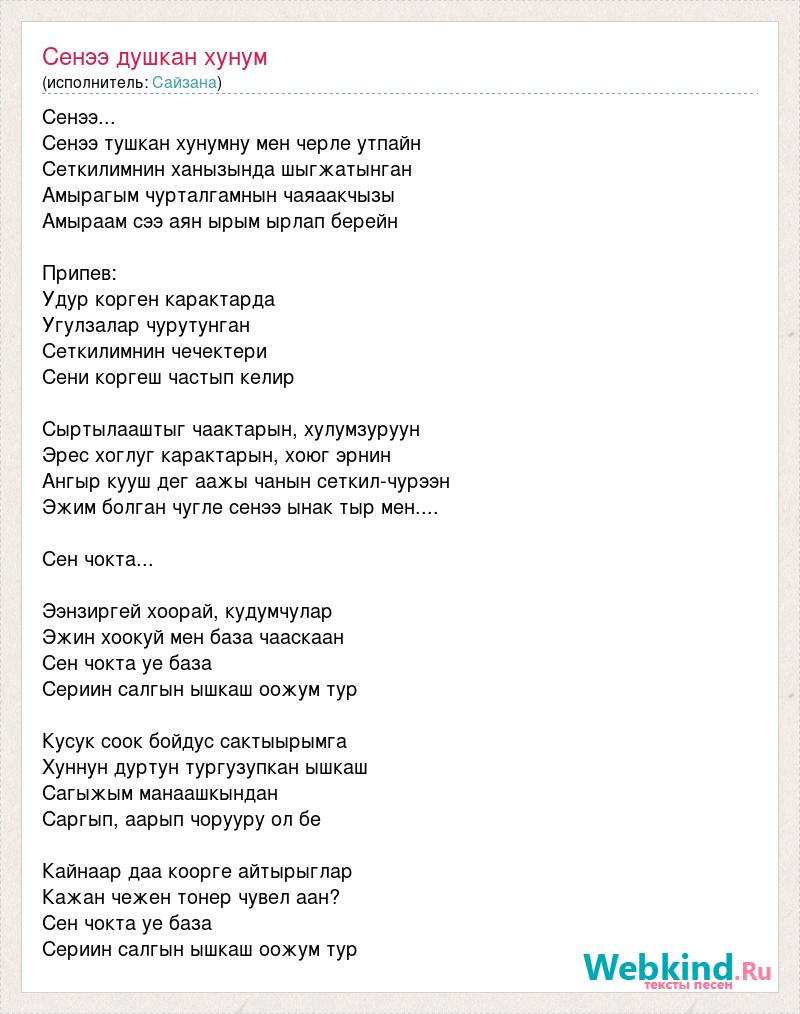 Сенээ... Сенээ тушкан хунумну мен черле утпайн Сеткилимнин ханызында шыгжатынган Амырагым чурталгамнын чаяаакчызы Амыраам сээ аян ырым ырлап берейн Припев: Удур корген карактарда Угулзалар чурутунган Сеткилимнин чечектери Сени коргеш частып келир Сыртылааштыг чаактарын, хулумзуруун Эрес хоглуг карактарын, хоюг эрнин Ангыр кууш дег аажы чанын сеткил-чурээн Эжим болган чугле сенээ ынак тыр мен.... Сен чокта... Ээнзиргей хоорай, кудумчулар Эжин хоокуй мен база чааскаан Сен чокта уе база Сериин салгын ышкаш оожум тур Кусук соок бойдус сактыырымга Хуннун дуртун тургузупкан ышкаш Сагыжым манаашкындан Саргып, аарып чорууру ол бе Кайнаар даа коорге айтырыглар Кажан чежен тонер чувел аан? Сен чокта уе база Сериин салгын ышкаш оожум тур