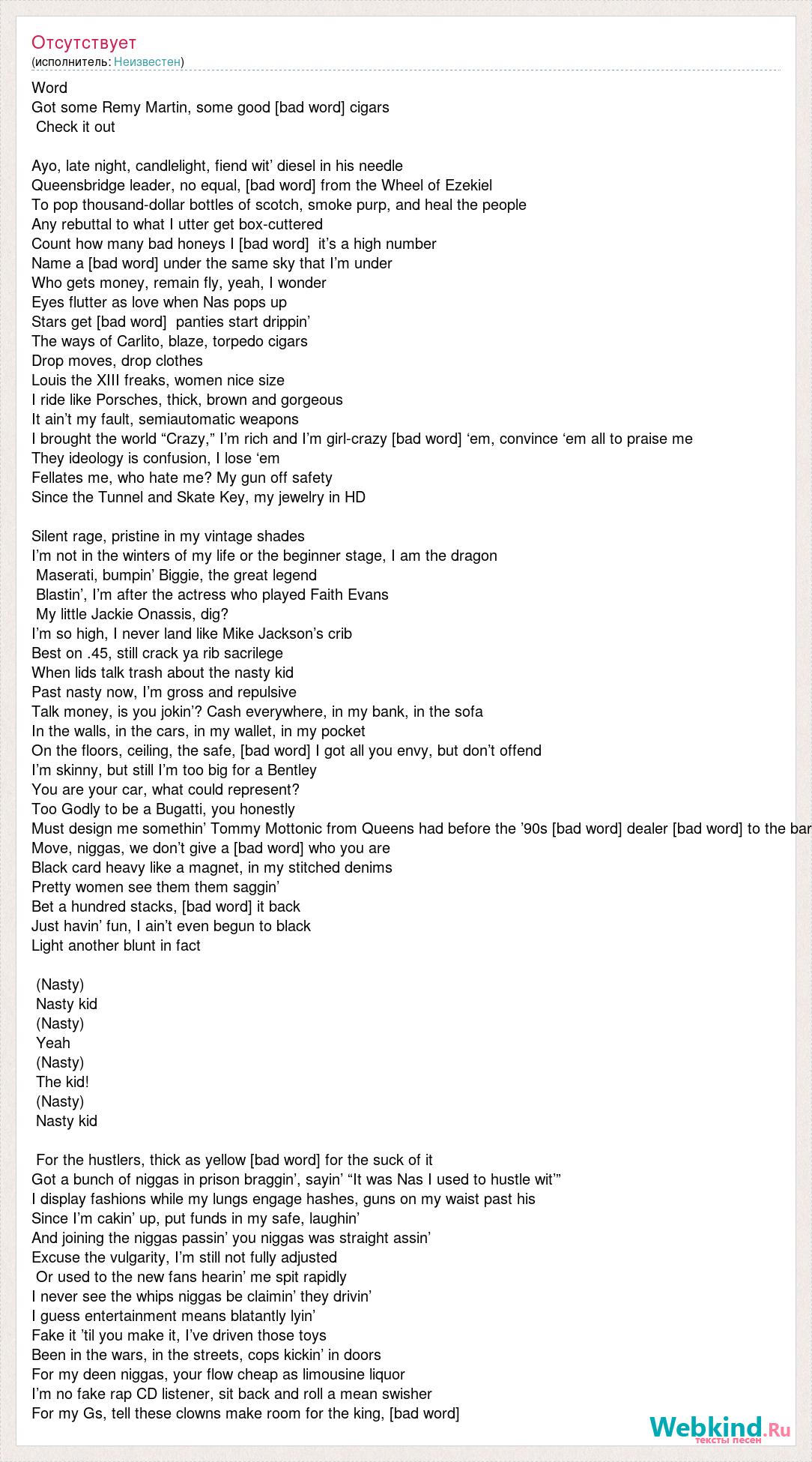 Word Got some Remy Martin, some good [bad word] cigars Check it out Ayo, late night, candlelight, fiend wit’ diesel in his needle Queensbridge leader, no equal, [bad word] from the Wheel of Ezekiel To pop thousand-dollar bottles of scotch, smoke purp, and heal the people Any rebuttal to what I utter get box-cuttered Count how many bad honeys I [bad word] it’s a high number Name a [bad word] under the same sky that I’m under Who gets money, remain fly, yeah, I wonder Eyes flutter as love when Nas pops up Stars get [bad word] panties start drippin’ The ways of Carlito, blaze, torpedo cigars Drop moves, drop clothes Louis the XIII freaks, women nice size I ride like Porsches, thick, brown and gorgeous It ain’t my fault, semiautomatic weapons I brought the world “Crazy,” I’m rich and I’m girl-crazy [bad word] ‘em, convince ‘em all to praise me They ideology is confusion, I lose ‘em Fellates me, who hate me? My gun off safety Since the Tunnel and Skate Key, my jewelry in HD Silent rage, pristine in my vintage shades I’m not in the winters of my life or the beginner stage, I am the dragon Maserati, bumpin’ Biggie, the great legend Blastin’, I’m after the actress who played Faith Evans My little Jackie Onassis, dig? I’m so high, I never land like Mike Jackson’s crib Best on .45, still crack ya rib sacrilege When lids talk trash about the nasty kid Past nasty now, I’m gross and repulsive Talk money, is you jokin’? Cash everywhere, in my bank, in the sofa In the walls, in the cars, in my wallet, in my pocket On the floors, ceiling, the safe, [bad word] I got all you envy, but don’t offend I’m skinny, but still I’m too big for a Bentley You are your car, what could represent? Too Godly to be a Bugatti, you honestly Must design me somethin’ Tommy Mottonic from Queens had before the ’90s [bad word] dealer [bad word] to the bar Move, niggas, we don’t give a [bad word] who you are Black card heavy like a magnet, in my stitched denims Pretty women see them them saggin’ Bet a hundred stacks, [bad word] it back Just havin’ fun, I ain’t even begun to black Light another blunt in fact (Nasty) Nasty kid (Nasty) Yeah (Nasty) The kid! (Nasty) Nasty kid For the hustlers, thick as yellow [bad word] for the suck of it Got a bunch of niggas in prison braggin’, sayin’ “It was Nas I used to hustle wit’” I display fashions while my lungs engage hashes, guns on my waist past his Since I’m cakin’ up, put funds in my safe, laughin’ And joining the niggas passin’ you niggas was straight assin’ Excuse the vulgarity, I’m still not fully adjusted Or used to the new fans hearin’ me spit rapidly I never see the whips niggas be claimin’ they drivin’ I guess entertainment means blatantly lyin’ Fake it ’til you make it, I’ve driven those toys Been in the wars, in the streets, cops kickin’ in doors For my deen niggas, your flow cheap as limousine liquor I’m no fake rap CD listener, sit back and roll a mean swisher For my Gs, tell these clowns make room for the king, [bad word]