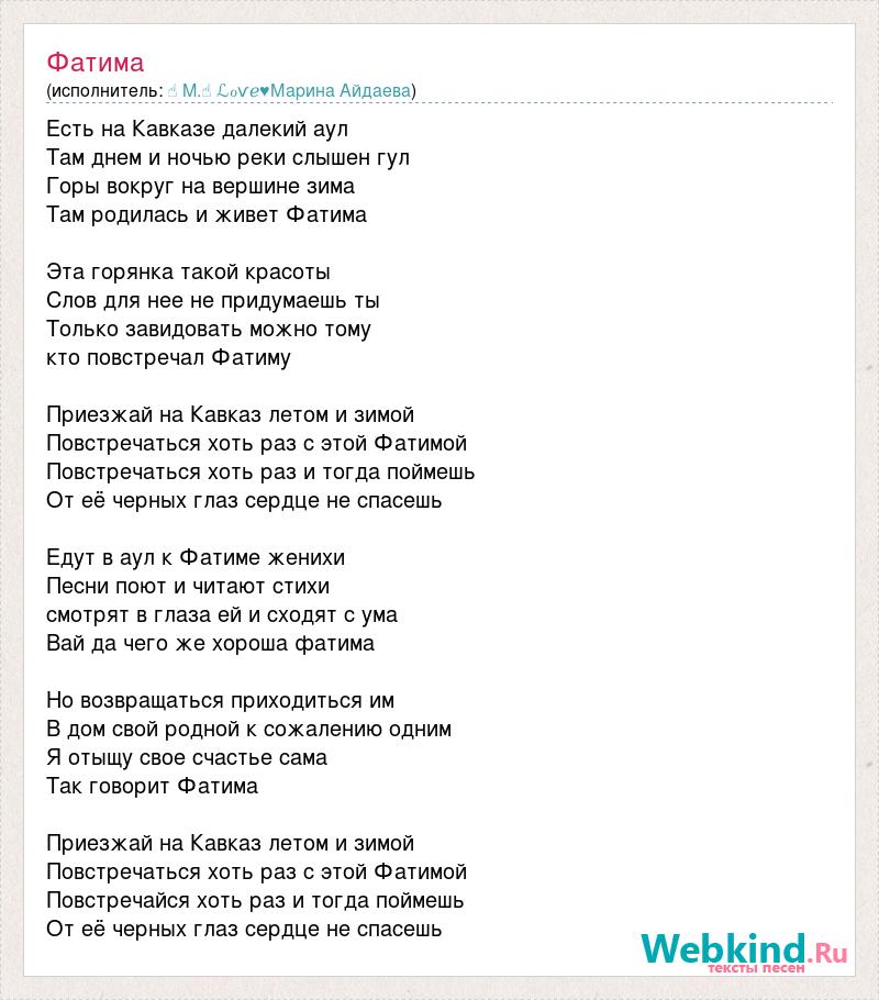 Есть на Кавказе далекий аул Там днем и ночью реки слышен гул Горы вокруг на вершине зима Там родилась и живет Фатима Эта горянка такой красоты Слов для нее не придумаешь ты Только завидовать можно тому кто повстречал Фатиму Приезжай на Кавказ летом и зимой Повстречаться хоть раз с этой Фатимой Повстречаться хоть раз и тогда поймешь От её черных глаз сердце не спасешь Едут в аул к Фатиме женихи Песни поют и читают стихи смотрят в глаза ей и сходят с ума Вай да чего же хороша фатима Но возвращаться приходиться им В дом свой родной к сожалению одним Я отыщу свое счастье сама Так говорит Фатима Приезжай на Кавказ летом и зимой Повстречаться хоть раз с этой Фатимой Повстречайся хоть раз и тогда поймешь От её черных глаз сердце не спасешь