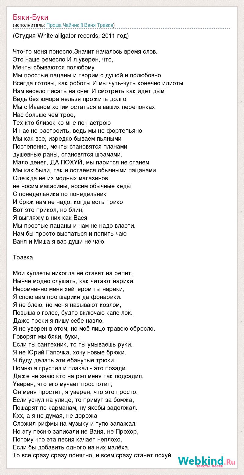 (Студия White alligator records, 2011 год) Что-то меня понесло,Значит началось время слов. Это наше ремесло И я уверен, что, Мечты сбываются полюбому Мы простые пацаны и творим с душой и полюбовно Всегда готовы, как роботы И мы чуть-чуть конечно идиоты Нам весело писать на снег И смотреть как идет дым Ведь без юмора нельзя прожить долго Мы с Иваном хотим остаться в ваших перепонках Нас больше чем трое, Тех кто близок ко мне по настрою И нас не растроить, ведь мы не фортепьяно Мы как все, изредко бываем пьяными Постепенно, мечты становятся планами душевные раны, становятся шрамами. Мало денег, ДА ПОХУЙ, мы парится не станем. Мы как были, так и остаемся обычными пацанами Одежда не из модных магазинов не носим макасины, носим обычные кеды С понедельника по понедельник И брюк нам не надо, когда есть трико Вот это прикол, но блин, Я выгляжу в них как Вася Мы простые пацаны и нам не надо власти. Нам бы просто выспаться и попить чаю Ваня и Миша я вас души не чаю Травка Мои куплеты никогда не ставят на репит, Нынче модно слушать, как читают нарики. Несомненно меня хейтером ты нареки, Я спою вам про шарики да фонарики. Я не блею, но меня называют козлом, Повышаю голос, будто включаю капс лок. Даже треки я пишу себе назло, Я не уверен в этом, но моё лицо травою обросло. Говорят мы бяки, буки, Если ты сантехник, то ты умываешь руки. Я не Юрий Гапочка, хочу новые брюки. Я буду делать эти ебанутые трюки. Помню я грустил и плакал - это позади. Даже не знаю кто на рэп меня так подсадил, Уверен, что его мучает простотит, Он меня простит, я уверен, что это просто. Если уснул на улице, то примут за бомжа, Пошарят по карманам, ну якобы задолжал. Кхх, а я не думая, не дорожа Сложил рифмы на музыку и тупо залажал. Но эту песню записали не Ваня, не Прохор, Потому что эта песня качает неплохо. Если бы добавить одного из них малёха, То всё сразу сразу понятно, и всем сразу станет похуй.