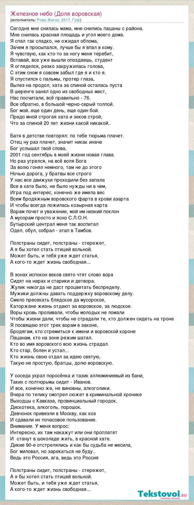Сегодня мне снилась мама, мне снились пацаны с района. Мне снилась красная площадь и угол моего дома. Я спал так сладко, не ожидал облома, Зачем я просыпался, лучше бы я впал в кому. Я чувствую, как кто-то за ногу меня теребит, Вставай, все уже вышли опоздаешь, студент Я огляделся, резко закружилась голова, С этим сном я совсем забыл где я и кто я. Я спустился с пальмы, протер глаза, Вылез на продол, хата за спиной осталась пуста В шеренге занял одно из свободных мест, Нас посчитали, всё правильно - 76. Все обратно, в большой черно-серый толпой. Бог мой..еще один день, еще один бой. Предо мной строгая хата и зеков строй, Что за спиной 20 лет жизни какой никакой.. Батя в детстве повторял: по тебе тюрьма плачет. Отец ну раз плачет, значит никак иначе Бог услышал твой слова, 2001 год сентябрь в моей жизни новая глава. Но раз угрелся, на всё воля Бога За волю гонял немного, там не до этого Ночью дорога, у братвы все строго У нас все движухи проходили без запала Все в хате было, не было нужды ни в чем, Игра под интерес, конечно же имела вес Всем бродяжным воровского фарта в крови азарта И чтобы всегда ложилась козырная карта Ворам почет и уважение, мой им низкий поклон А мусорам просто и ясно С.Л.О.Н. Бутырский централ меня так воспитал Одел, обул, собрал - этап в Тамбов. Полстраны сидит, полстраны - стережет, А я бы хотел стать птицей вольной. Может быть, и тебя уже ждет статья, А кого-то ждет жизнь свободная... В зонах испокон веков свято чтят слово вора Сидят на нарах и старики и детвора. Жулик никогда не даст процветать беспределу. Мужики должны давать поддержку воровскому делу. Смело пресекать блядское да мусорское, Каторжане жизнь отдают за воровское, за людское. Воры кровь проливали, чтобы молодых не ломали Чтобы жизни дали, чтобы не страдали те, кто должен сидеть на троне Я посвящаю этот трек ворам в законе, Бродягам, кто стремиться к имени и воровской короне Пацанам, кто на зоне режим шатал. Кто во имя воровского всю жизнь страдал. Кто стар, болен и устал... Кто жизнь свою отдал за идею святую, Такую не простую, братцы, долю воровскую. У соседа украл поросёнка и тазик аллюминиевый из бани, Таких с полтюрьмы сидит - Иванов. И все, конечно же, не виновны, алкоголики. Вчера по телику смотрел сюжет в криминальной хронике Выходцы с Кавказа, провинциальный городок. Дискотека, алкоголь, порошок. Девчонок привезли в Москву, как коз И сдавали их почасовое пользование. Внимание. У меня вопрос: Интересно, их там накажут или они проплатят И станут в шоколаде жить, в красной хате. Дикие 90-е отстрелялись и как бы судьба не месила, Бог миловал, но зарекаться не буду.. Ведь это Россия, ага, ведь это Россия Полстраны сидит, полстраны - стережет, А я бы хотел стать птицей вольной. Может быть, и тебя уже ждет статья, А кого-то ждет жизнь свободная...