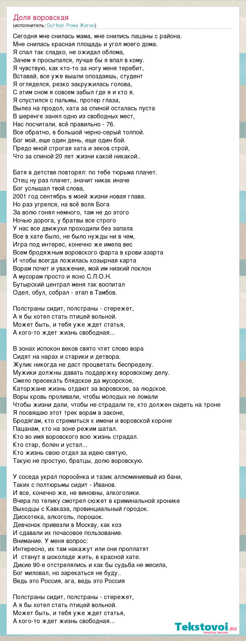 Сегодня мне снилась мама, мне снились пацаны с района. Мне снилась красная площадь и угол моего дома. Я спал так сладко, не ожидал облома, Зачем я просыпался, лучше бы я впал в кому. Я чувствую, как кто-то за ногу меня теребит, Вставай, все уже вышли опоздаешь, студент Я огляделся, резко закружилась голова, С этим сном я совсем забыл где я и кто я. Я спустился с пальмы, протер глаза, Вылез на продол, хата за спиной осталась пуста В шеренге занял одно из свободных мест, Нас посчитали, всё правильно - 76. Все обратно, в большой черно-серый толпой. Бог мой..еще один день, еще один бой. Предо мной строгая хата и зеков строй, Что за спиной 20 лет жизни какой никакой.. Батя в детстве повторял: по тебе тюрьма плачет. Отец ну раз плачет, значит никак иначе Бог услышал твой слова, 2001 год сентябрь в моей жизни новая глава. Но раз угрелся, на всё воля Бога За волю гонял немного, там не до этого Ночью дорога, у братвы все строго У нас все движухи проходили без запала Все в хате было, не было нужды ни в чем, Игра под интерес, конечно же имела вес Всем бродяжным воровского фарта в крови азарта И чтобы всегда ложилась козырная карта Ворам почет и уважение, мой им низкий поклон А мусорам просто и ясно С.Л.О.Н. Бутырский централ меня так воспитал Одел, обул, собрал - этап в Тамбов. Полстраны сидит, полстраны - стережет, А я бы хотел стать птицей вольной. Может быть, и тебя уже ждет статья, А кого-то ждет жизнь свободная... В зонах испокон веков свято чтят слово вора Сидят на нарах и старики и детвора. Жулик никогда не даст процветать беспределу. Мужики должны давать поддержку воровскому делу. Смело пресекать блядское да мусорское, Каторжане жизнь отдают за воровское, за людское. Воры кровь проливали, чтобы молодых не ломали Чтобы жизни дали, чтобы не страдали те, кто должен сидеть на троне Я посвящаю этот трек ворам в законе, Бродягам, кто стремиться к имени и воровской короне Пацанам, кто на зоне режим шатал. Кто во имя воровского всю жизнь страдал. Кто стар, болен и устал... Кто жизнь свою отдал за идею святую, Такую не простую, братцы, долю воровскую. У соседа украл поросёнка и тазик аллюминиевый из бани, Таких с полтюрьмы сидит - Иванов. И все, конечно же, не виновны, алкоголики. Вчера по телику смотрел сюжет в криминальной хронике Выходцы с Кавказа, провинциальный городок. Дискотека, алкоголь, порошок. Девчонок привезли в Москву, как коз И сдавали их почасовое пользование. Внимание. У меня вопрос: Интересно, их там накажут или они проплатят И станут в шоколаде жить, в красной хате. Дикие 90-е отстрелялись и как бы судьба не месила, Бог миловал, но зарекаться не буду.. Ведь это Россия, ага, ведь это Россия Полстраны сидит, полстраны - стережет, А я бы хотел стать птицей вольной. Может быть, и тебя уже ждет статья, А кого-то ждет жизнь свободная...