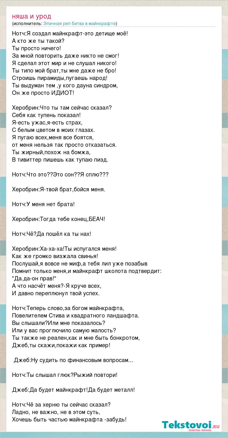 Нотч:Я создал майнкрафт-это детище моё! А кто же ты такой? Ты просто ничего! За мной повторить даже никто не смог! Я сделал этот мир и не слушал никого! Ты типо мой брат,ты мне даже не бро! Строишь пирамиды,пугаешь народ! Ты выдуман тем ,у кого дауна синдром, Он же просто ИДИОТ! Херобрин:Что ты там сейчас сказал? Себя как тупень показал! Я-есть ужас,я-есть страх, С белым цветом в моих глазах. Я пугаю всех,меня все боятся, от меня нельзя так просто отказаться. Ты жирный,похож на бомжа, В тивиттер пишешь как тупаю пизд. Нотч:Что это??Это сон??Я сплю??? Херобрин:Я-твой брат,бойся меня. Нотч:У меня нет брата! Херобрин:Тогда тебе конец,БЕАЧ! Нотч:Чё?Да пошёл ка ты нах! Херобрин:Ха-ха-ха!Ты испугался меня! Как же громко визжала свинья! Послушай,я вовсе не миф,а тебя лил уже позабыв Помнит только меня,и майнкрафт школота подтвердит: "Да.да-он прав!" А что насчёт меня?-Я круче всех, И давно переплюнул твой успех. Нотч:Теперь слово,за богом майнкрафта, Повелителем Стива и квадратного ландшафта. Вы слышали?Или мне показалось? Или у вас проглючило самую малость? Ты также не реален,как и мне быть бонкротом, Джеб,ты скажи,покажи как пример! Джеб:Ну судить по финансовым вопросам... Нотч:Ты слышал глюк?Рыжий повтори! Джеб:Да будет майнкрафт!Да будет металл! Нотч:Чё за херню ты сейчас сказал? Ладно, не важно, не в этом суть, Хочешь быть частью майнкрафта -забудь!