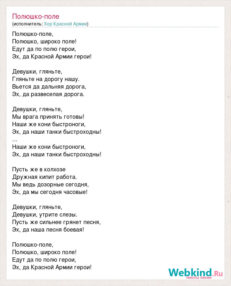 Полюшко-поле, Полюшко, широко поле! Едут да по полю герои, Эх, да Красной Армии герои! Девушки, гляньте, Гляньте на дорогу нашу. Вьется да дальняя дорога, Эх, да развеселая дорога. Девушки, гляньте, Мы врага принять готовы! Наши же кони быстроноги, Эх, да наши танки быстроходны! ... Наши же кони быстроноги, Эх, да наши танки быстроходны! Пусть же в колхозе Дружная кипит работа. Мы ведь дозорные сегодня, Эх, да мы сегодня часовые! Девушки, гляньте, Девушки, утрите слезы. Пусть же сильнее грянет песня, Эх, да наша песня боевая! Полюшко-поле, Полюшко, широко поле! Едут да по полю герои, Эх, да Красной Армии герои!