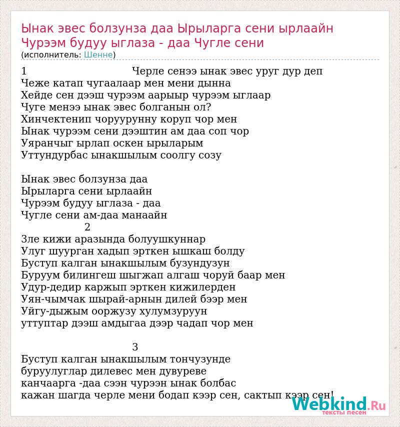 Ынак эвес болзунза даа Ырыларга сени ырлаайн Чурээм будуу ыглаза - даа Чугле сен