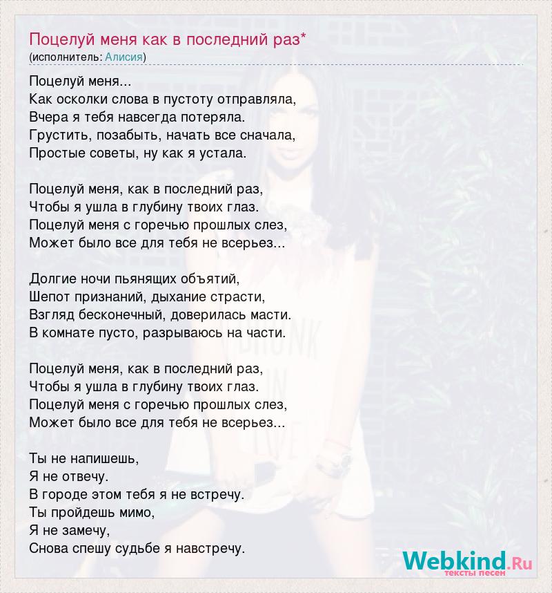 Поцелуй меня... Как осколки слова в пустоту отправляла, Вчера я тебя навсегда потеряла. Грустить, позабыть, начать все сначала, Простые советы, ну как я устала. Поцелуй меня, как в последний раз, Чтобы я ушла в глубину твоих глаз. Поцелуй меня с горечью прошлых слез, Может было все для тебя не всерьез... Долгие ночи пьянящих объятий, Шепот признаний, дыхание страсти, Взгляд бесконечный, доверилась масти. В комнате пусто, разрываюсь на части. Поцелуй меня, как в последний раз, Чтобы я ушла в глубину твоих глаз. Поцелуй меня с горечью прошлых слез, Может было все для тебя не всерьез... Ты не напишешь, Я не отвечу. В городе этом тебя я не встречу. Ты пройдешь мимо, Я не замечу, Снова спешу судьбе я навстречу.