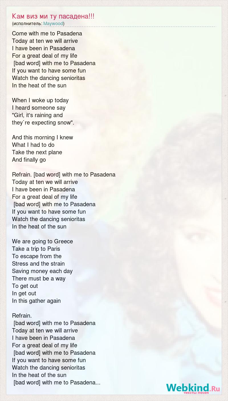 Come with me to Pasadena Today at ten we will arrive I have been in Pasadena For a great deal of my life [bad word] with me to Pasadena If you want to have some fun Watch the dancing senioritas In the heat of the sun When I woke up today I heard someone say "Girl, it's raining and they`re expecting snow". And this morning I knew What I had to do Take the next plane And finally go Refrain. [bad word] with me to Pasadena Today at ten we will arrive I have been in Pasadena For a great deal of my life [bad word] with me to Pasadena If you want to have some fun Watch the dancing senioritas In the heat of the sun We are going to Greece Take a trip to Paris To escape from the Stress and the strain Saving money each day There must be a way To get out In get out In this gather again Refrain. [bad word] with me to Pasadena Today at ten we will arrive I have been in Pasadena For a great deal of my life [bad word] with me to Pasadena If you want to have some fun Watch the dancing senioritas In the heat of the sun [bad word] with me to Pasadena...
