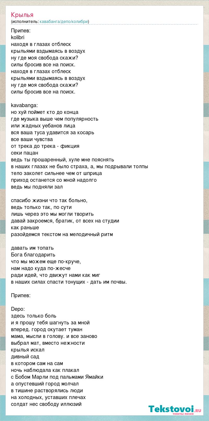 Припев: kolibri находя в глазах отблеск крыльями вздымаясь в воздух ну где моя свобода скажи? силы бросив все на поиск. находя в глазах отблеск крыльями вздымаясь в воздух ну где моя свобода скажи? силы бросив все на поиск. kavabanga: но хуй поймет кто до конца где музыка выше чем популярность или жадных уебанов лица вся ваша туса удавится за косарь все ваши чувства от трека до трека - фикция секи пацан ведь ты прошаренный, хуле мне пояснять в наших глазах не было страха, а, мы подрывали толпы тело заколет сильнее чем от шприца приход останется со мной надолго ведь мы подняли зал спасибо жизни что так больно, ведь только так, по сути лишь через это мы могли творить давай закроемся, братик, от всех на студии как раньше разойдемся текстом на мелодичный ритм давать им топать Бога благодарить что мы можем еще по-круче, нам надо куда по-жесче ради идей, что движут нами как миг в наших силах спасти тонущих - дать им почвы. Припев: Depo: здесь только боль и я прошу тебя шагнуть за мной вперед. город окутает туман мама, мысли в голову. и все заново выбрал мат, вместо нежности крылья искал дивный сад в котором сам на сам ночь наблюдала как плакал с Бобом Марли под пальмами Ямайки а опустевший город молчал в тишине растворялись люди на холодных, уставших плечах солдат нес свободу иллюзий