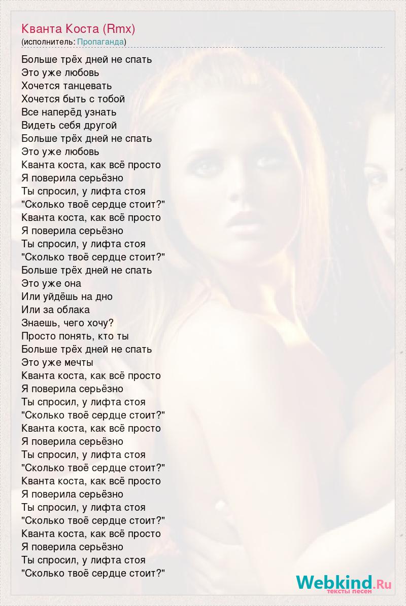 Больше трёх дней не спать Это уже любовь Хочется танцевать Хочется быть с тобой Все наперёд узнать Видеть себя другой Больше трёх дней не спать Это уже любовь Кванта коста, как всё просто Я поверила серьёзно Ты спросил, у лифта стоя "Сколько твоё сердце стоит?" Кванта коста, как всё просто Я поверила серьёзно Ты спросил, у лифта стоя "Сколько твоё сердце стоит?" Больше трёх дней не спать Это уже она Или уйдёшь на дно Или за облака Знаешь, чего хочу? Просто понять, кто ты Больше трёх дней не спать Это уже мечты Кванта коста, как всё просто Я поверила серьёзно Ты спросил, у лифта стоя "Сколько твоё сердце стоит?" Кванта коста, как всё просто Я поверила серьёзно Ты спросил, у лифта стоя "Сколько твоё сердце стоит?" Кванта коста, как всё просто Я поверила серьёзно Ты спросил, у лифта стоя "Сколько твоё сердце стоит?" Кванта коста, как всё просто Я поверила серьёзно Ты спросил, у лифта стоя "Сколько твоё сердце стоит?"