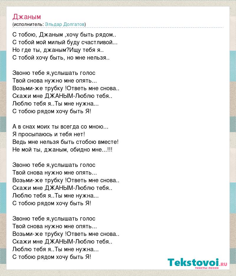 С тобою, Джаным ,хочу быть рядом.. С тобой мой милый буду счастливой... Но где ты, джаным?Ищу тебя я.. С тобой хочу быть, но мне нельзя.. Звоню тебе я,услышать голос Твой снова нужно мне опять... Возьми-же трубку !Ответь мне снова.. Скажи мне ДЖАНЫМ-Люблю тебя.. Люблю тебя я..Ты мне нужна... С тобою рядом хочу быть Я! А в снах моих ты всегда со мною... Я просыпаюсь и тебя нет! Ведь мне нельзя быть стобою вместе! Не мой ты, джаным, обидно мне...!!! Звоню тебе я,услышать голос Твой снова нужно мне опять... Возьми-же трубку !Ответь мне снова.. Скажи мне ДЖАНЫМ-Люблю тебя.. Люблю тебя я..Ты мне нужна... С тобою рядом хочу быть Я! Звоню тебе я,услышать голос Твой снова нужно мне опять... Возьми-же трубку !Ответь мне снова.. Скажи мне ДЖАНЫМ-Люблю тебя.. Люблю тебя я..Ты мне нужна... С тобою рядом хочу быть Я!