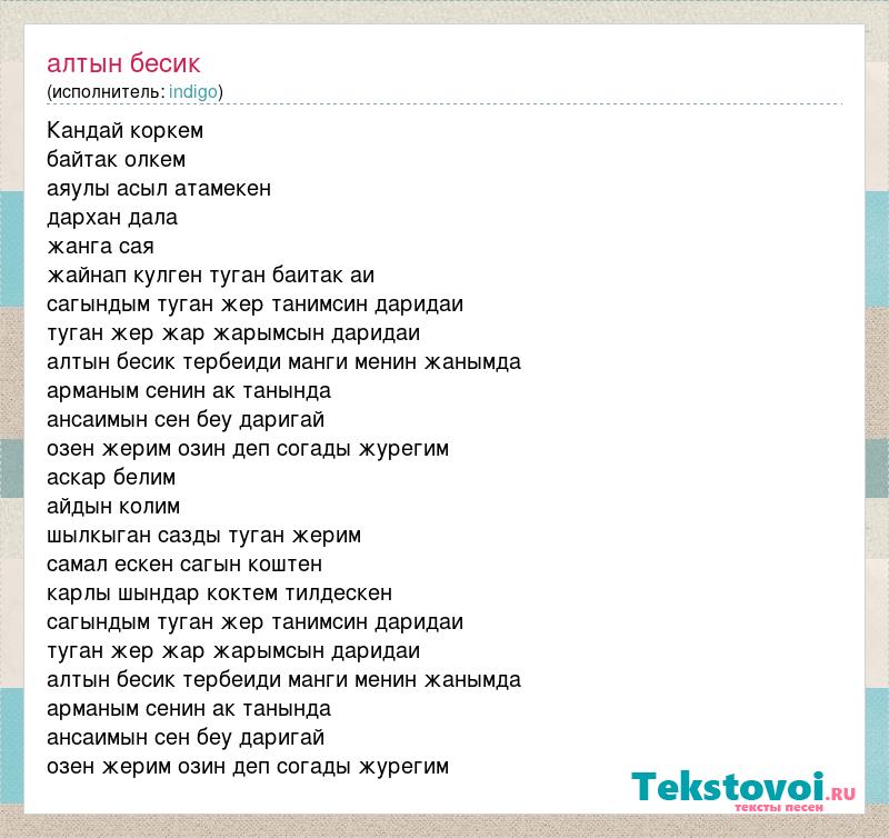 Кандай коркем байтак олкем аяулы асыл атамекен дархан дала жанга сая жайнап кулген туган баитак аи сагындым туган жер танимсин даридаи туган жер жар жарымсын даридаи алтын бесик тербеиди манги менин жанымда арманым сенин ак танында ансаимын сен беу даригай озен жерим озин деп согады журегим аскар белим айдын колим шылкыган сазды туган жерим самал ескен сагын коштен карлы шындар коктем тилдескен сагындым туган жер танимсин даридаи туган жер жар жарымсын даридаи алтын бесик тербеиди манги менин жанымда арманым сенин ак танында ансаимын сен беу даригай озен жерим озин деп согады журегим