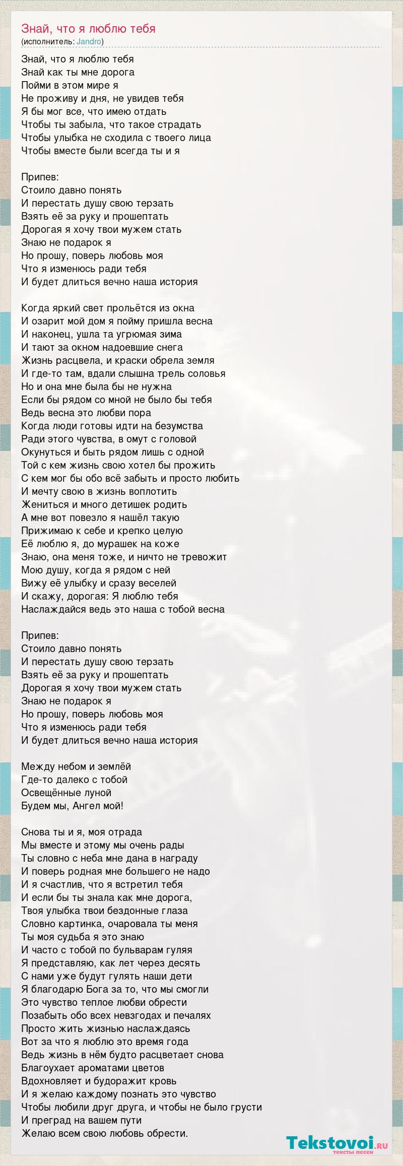 Знай, что я люблю тебя Знай как ты мне дорога Пойми в этом мире я Не проживу и дня, не увидев тебя Я бы мог все, что имею отдать Чтобы ты забыла, что такое страдать Чтобы улыбка не сходила с твоего лица Чтобы вместе были всегда ты и я Припев: Стоило давно понять И перестать душу свою терзать Взять её за руку и прошептать Дорогая я хочу твои мужем стать Знаю не подарок я Но прошу, поверь любовь моя Что я изменюсь ради тебя И будет длиться вечно наша история Когда яркий свет прольётся из окна И озарит мой дом я пойму пришла весна И наконец, ушла та угрюмая зима И тают за окном надоевшие снега Жизнь расцвела, и краски обрела земля И где-то там, вдали слышна трель соловья Но и она мне была бы не нужна Если бы рядом со мной не было бы тебя Ведь весна это любви пора Когда люди готовы идти на безумства Ради этого чувства, в омут с головой Окунуться и быть рядом лишь с одной Той с кем жизнь свою хотел бы прожить С кем мог бы обо всё забыть и просто любить И мечту свою в жизнь воплотить Жениться и много детишек родить А мне вот повезло я нашёл такую Прижимаю к себе и крепко целую Её люблю я, до мурашек на коже Знаю, она меня тоже, и ничто не тревожит Мою душу, когда я рядом с ней Вижу её улыбку и сразу веселей И скажу, дорогая: Я люблю тебя Наслаждайся ведь это наша с тобой весна Припев: Стоило давно понять И перестать душу свою терзать Взять её за руку и прошептать Дорогая я хочу твои мужем стать Знаю не подарок я Но прошу, поверь любовь моя Что я изменюсь ради тебя И будет длиться вечно наша история Между небом и землёй Где-то далеко с тобой Освещённые луной Будем мы, Ангел мой! Снова ты и я, моя отрада Мы вместе и этому мы очень рады Ты словно с неба мне дана в награду И поверь родная мне большего не надо И я счастлив, что я встретил тебя И если бы ты знала как мне дорога, Твоя улыбка твои бездонные глаза Словно картинка, очаровала ты меня Ты моя судьба я это знаю И часто с тобой по бульварам гуляя Я представляю, как лет через десять С нами уже будут гулять наши дети Я благодарю Бога за то, что мы смогли Это чувство теплое любви обрести Позабыть обо всех невзгодах и печалях Просто жить жизнью наслаждаясь Вот за что я люблю это время года Ведь жизнь в нём будто расцветает снова Благоухает ароматами цветов Вдохновляет и будоражит кровь И я желаю каждому познать это чувство Чтобы любили друг друга, и чтобы не было грусти И преград на вашем пути Желаю всем свою любовь обрести.