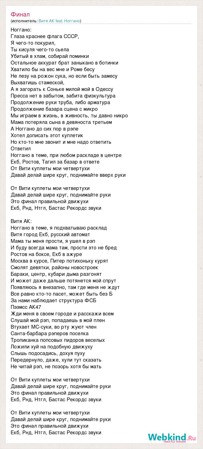 Ноггано: Глаза краснее флага СССР, Я чего-то покурил, Ты кисуля чего-то сьела Убитый в хлам, собирай поминки Остальное аккурат брат заныкано в ботинки Хватило бы на вес мне и Роме бесу Не лезу на рожон сука, но если быть замесу Выхватишь стамеской, А я загорать к Соньке милой мой в Одессу Пресса нет в забытом, забита физкультура Продолжение руки труба, либо арматура Продолжение базара сцена с микро Мы играем в жизнь, в живность, ты давно никро Мама потеряла сына в девяноста третьем А Ноггано до сих пор в рэпе Хотел дописать этот куплетик Но кто-то мне звонит и мне надо ответить Ответил Ноггано в теме, при любом раскладе в центре Екб, Ростов, Тагил за базар в ответе От Вити куплеты мои четвертухи Давай делай шире круг, поднимайте вверх руки От Вити куплеты мои четвертухи Давай делай шире круг, поднимайте руки Это финал правильной движухи Екб, Рнд, Нтгл, Бастас Рекордс звуки Витя АК: Ноггано в теме, я подхватываю расклад Витя город Екб, русский автомат Мама ты меня прости, я ушел в рэп И буду всегда мама там, прости это не бред Ростов на боксе, Екб в ажуре Москва в курсе, Питер потихоньку курят Смолят девятки, районы новостроек Бараки, центр, кубари дыма разгонят И может даже дальше потянется мой спрут Появляюсь я внезапно, там где меня не ждут Все равно кто-то пасет, может быть без Б За нами наблюдает структура ФСБ Пээмсс АК47 Жди меня в своем городе и расскажи всем Слушай мой рэп, попадаешь в мой плен Втухает МС-суки, во рту жуют член Санта-барбара рэперов поселка Тропиканка попсовых пидоров веселых Ложили хуй на подобную движуху Слышь подосадись, дохуя пуху Передернуло, даже, хули тут сказать Не читай рэп, не позорь хотя бы мать От Вити куплеты мои четвертухи Давай делай шире круг, поднимайте руки Это финал правильной движухи Екб, Рнд, Нтгл, Бастас Рекордс звуки От Вити куплеты мои четвертухи Давай делай шире круг, поднимайте руки Это финал правильной движухи Екб, Рнд, Нтгл, Бастас Рекордс звуки