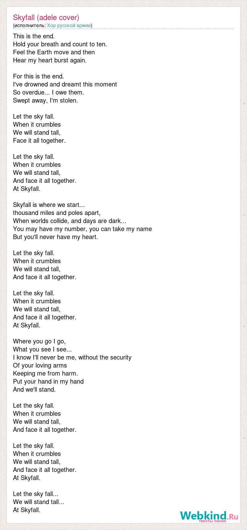 This is the end. Hold your breath and count to ten. Feel the Earth move and then Hear my heart burst again. For this is the end. I've drowned and dreamt this moment So overdue... I owe them. Swept away, I'm stolen. Let the sky fall. When it crumbles We will stand tall, Face it all together. Let the sky fall. When it crumbles We will stand tall, And face it all together. At Skyfall. Skyfall is where we start... thousand miles and poles apart, When worlds collide, and days are dark... You may have my number, you can take my name But you'll never have my heart. Let the sky fall. When it crumbles We will stand tall, And face it all together. Let the sky fall. When it crumbles We will stand tall, And face it all together. At Skyfall. Where you go I go, What you see I see... I know I'll never be me, without the security Of your loving arms Keeping me from harm. Put your hand in my hand And we'll stand. Let the sky fall. When it crumbles We will stand tall, And face it all together. Let the sky fall. When it crumbles We will stand tall, And face it all together. At Skyfall. Let the sky fall... We will stand tall... At Skyfall.