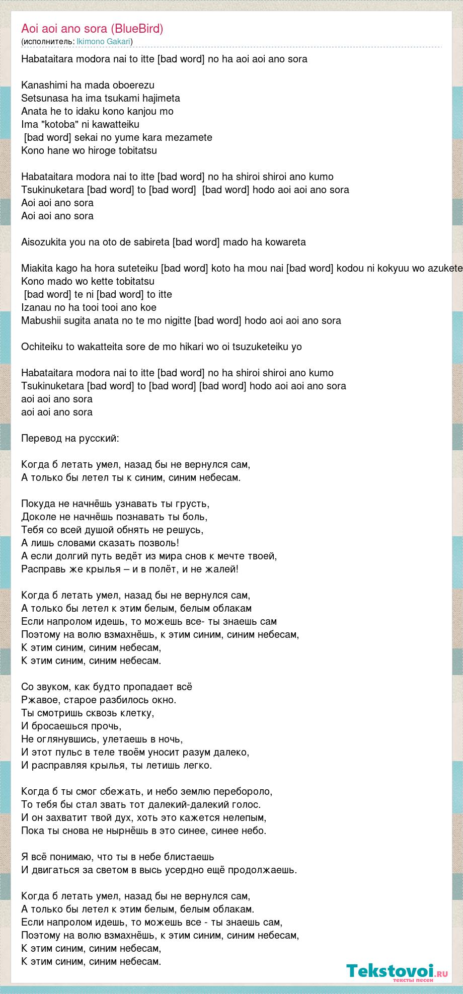 Habataitara modora nai to itte [bad word] no ha aoi aoi ano sora Kanashimi ha mada oboerezu Setsunasa ha ima tsukami hajimeta Anata he to idaku kono kanjou mo Ima "kotoba" ni kawatteiku Michinaru sekai no yume kara mezamete Kono hane wo hiroge tobitatsu Habataitara modora nai to itte [bad word] no ha shiroi shiroi ano kumo Tsukinuketara mitsukaru to [bad word] Furikiru hodo aoi aoi ano sora Aoi aoi ano sora Aoi aoi ano sora Aisozukita you na oto de sabireta furui mado ha kowareta Miakita kago ha hora suteteiku furikaeru koto ha mou nai Takanaru kodou ni kokyuu wo azukete Kono mado wo kette tobitatsu [bad word] te ni dekiru to itte Izanau no ha tooi tooi ano koe Mabushii sugita anata no te mo nigitte Motomeru hodo aoi aoi ano sora Ochiteiku to wakatteita sore de mo hikari wo oi tsuzuketeiku yo Habataitara modora nai to itte [bad word] no ha shiroi shiroi ano kumo Tsukinuketara mitsukaru to [bad word] Furikiru hodo aoi aoi ano sora aoi aoi ano sora aoi aoi ano sora Перевод на русский: Когда б летать умел, назад бы не вернулся сам, А только бы летел ты к синим, синим небесам. Покуда не начнёшь узнавать ты грусть, Доколе не начнёшь познавать ты боль, Тебя со всей душой обнять не решусь, А лишь словами сказать позволь! А если долгий путь ведёт из мира снов к мечте твоей, Расправь же крылья – и в полёт, и не жалей! Когда б летать умел, назад бы не вернулся сам, А только бы летел к этим белым, белым облакам Если напролом идешь, то можешь все- ты знаешь сам Поэтому на волю взмахнёшь, к этим синим, синим небесам, К этим синим, синим небесам, К этим синим, синим небесам. Со звуком, как будто пропадает всё Ржавое, старое разбилось окно. Ты смотришь сквозь клетку, И бросаешься прочь, Не оглянувшись, улетаешь в ночь, И этот пульс в теле твоём уносит разум далеко, И расправляя крылья, ты летишь легко. Когда б ты смог сбежать, и небо землю перебороло, То тебя бы стал звать тот далекий-далекий голос. И он захватит твой дух, хоть это кажется нелепым, Пока ты снова не нырнёшь в это синее, синее небо. Я всё понимаю, что ты в небе блистаешь И двигаться за светом в высь усердно ещё продолжаешь. Когда б летать умел, назад бы не вернулся сам, А только бы летел к этим белым, белым облакам. Если напролом идешь, то можешь все - ты знаешь сам, Поэтому на волю взмахнёшь, к этим синим, синим небесам, К этим синим, синим небесам, К этим синим, синим небесам.