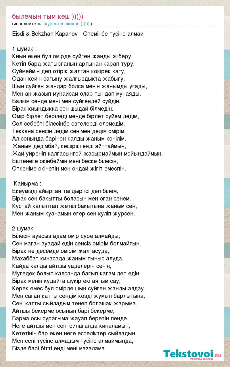 Eisdi & Bekzhan Kapanov - Отемiнбе тусiне алмай 1 шумак : Киын екен бул омiрде суйген жанды жiберу, Кетiп бара жатырганын артынан карап туру. Cуймеймiн деп отiрiк жалган кокiрек кагу, Одан кейiн сагыну жалгыздыкта жабыгу. Шын суйген жандар болса менiн жанымды угады, Мен ан жазып мунайсам олар тындап мунаяды. Балкiм сенде менi мен суйгендей суйдiн, Бiрак киындыкка сен шыдай бiлмедiн. Омiр бiрлет берiледi менде бiрлет суйем дедiм, Cол себебтi бiлесiнбе озгелердi елемедiм. Теккана сенсiн дедiм сенiмен дедiм омiрiм, Ал сонында барiнен калды жаным конiлiм. Жаным дедiмба?, кешiршi ендi айтпаймын, Жай уйренiп калгасынгой жасырмаймын мойындаймын. Ештенеге окiнбеймiн менi беске бiлесiн, Откенiме окiнетiн мен ондай жiгiт емеспiн. Кайырма : Екеумiздi айырган тагдыр iсi деп бiлем, Бiрак сен бакытты болaсын мен оган сенем. Кустай калыптап жетшi бакытына жаным сен, Мен жаным куанамын егер сен кулiп журсен. 2 шумак : Бiлесiн ауасыз адам омiр суре алмайды, Cен маган ауадай едiн сенсiз омiрiм болмайтын. Бiрак не десемде омiрiм жалгасуда, Махаббат кинасада,жаным тыныс алуда. Кайда калды айтшы уаделерiн сенiн, Мугедек болып калсанда багып кагам деп едiн. Бiрак менiн кудайга шукiр екi аягым сау, Керек емес бул омiрде шын суйген жанды алдау. Мен саган катты сендiм коздi жумып барлыгына, Cенi катты сыйладым тенеп болашак жарыма. Айтшы бекерме осынын барi бекерме, Барма осы сурагыма жауап беретiн пенде. Неге айтшы мен сенi ойлаганда киналамын, Кететiнiн бар екен неге естелiктер сыйладын. Мен сенi тусiне алмадым тусiне алмаймында, Бiзде барi бiттi ендi менi мазалама.
