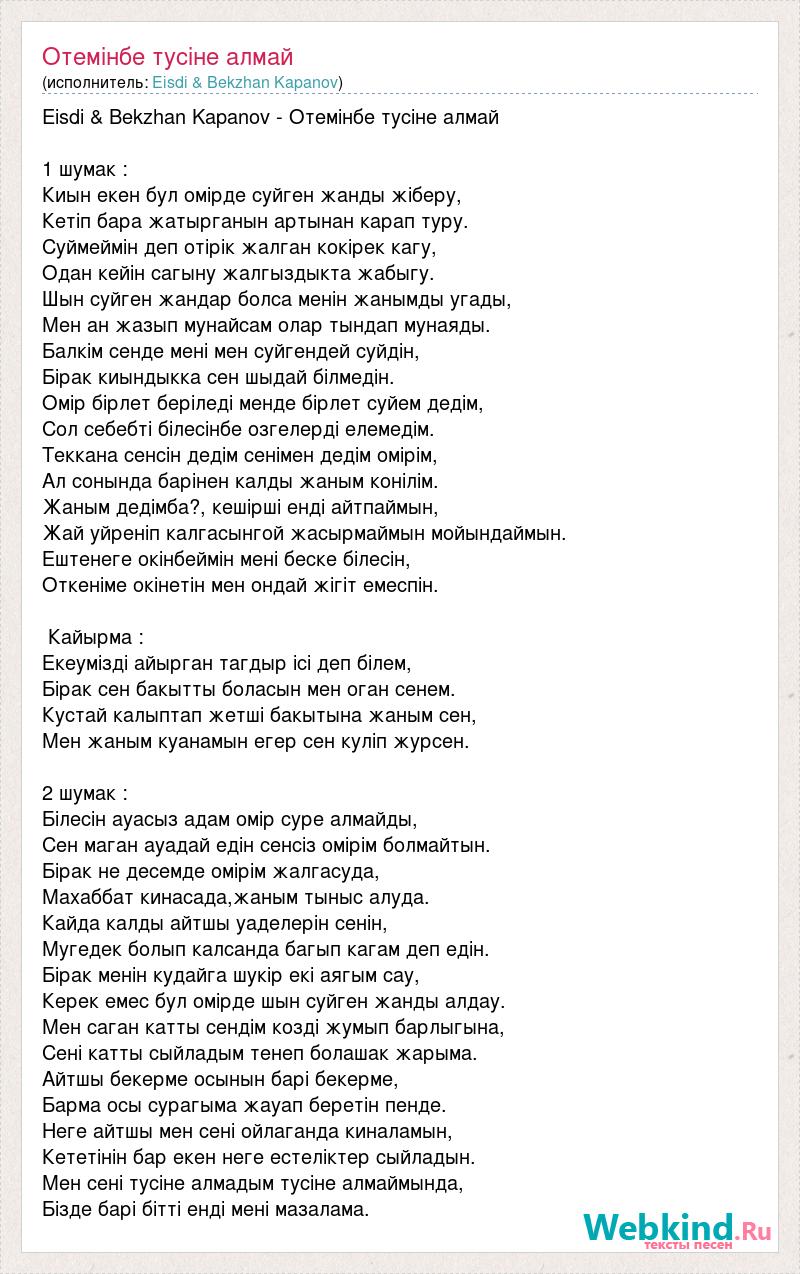 Eisdi & Bekzhan Kapanov - Отемiнбе тусiне алмай 1 шумак : Киын екен бул омiрде суйген жанды жiберу, Кетiп бара жатырганын артынан карап туру. Cуймеймiн деп отiрiк жалган кокiрек кагу, Одан кейiн сагыну жалгыздыкта жабыгу. Шын суйген жандар болса менiн жанымды угады, Мен ан жазып мунайсам олар тындап мунаяды. Балкiм сенде менi мен суйгендей суйдiн, Бiрак киындыкка сен шыдай бiлмедiн. Омiр бiрлет берiледi менде бiрлет суйем дедiм, Cол себебтi бiлесiнбе озгелердi елемедiм. Теккана сенсiн дедiм сенiмен дедiм омiрiм, Ал сонында барiнен калды жаным конiлiм. Жаным дедiмба?, кешiршi ендi айтпаймын, Жай уйренiп калгасынгой жасырмаймын мойындаймын. Ештенеге окiнбеймiн менi беске бiлесiн, Откенiме окiнетiн мен ондай жiгiт емеспiн. Кайырма : Екеумiздi айырган тагдыр iсi деп бiлем, Бiрак сен бакытты болaсын мен оган сенем. Кустай калыптап жетшi бакытына жаным сен, Мен жаным куанамын егер сен кулiп журсен. 2 шумак : Бiлесiн ауасыз адам омiр суре алмайды, Cен маган ауадай едiн сенсiз омiрiм болмайтын. Бiрак не десемде омiрiм жалгасуда, Махаббат кинасада,жаным тыныс алуда. Кайда калды айтшы уаделерiн сенiн, Мугедек болып калсанда багып кагам деп едiн. Бiрак менiн кудайга шукiр екi аягым сау, Керек емес бул омiрде шын суйген жанды алдау. Мен саган катты сендiм коздi жумып барлыгына, Cенi катты сыйладым тенеп болашак жарыма. Айтшы бекерме осынын барi бекерме, Барма осы сурагыма жауап беретiн пенде. Неге айтшы мен сенi ойлаганда киналамын, Кететiнiн бар екен неге естелiктер сыйладын. Мен сенi тусiне алмадым тусiне алмаймында, Бiзде барi бiттi ендi менi мазалама.