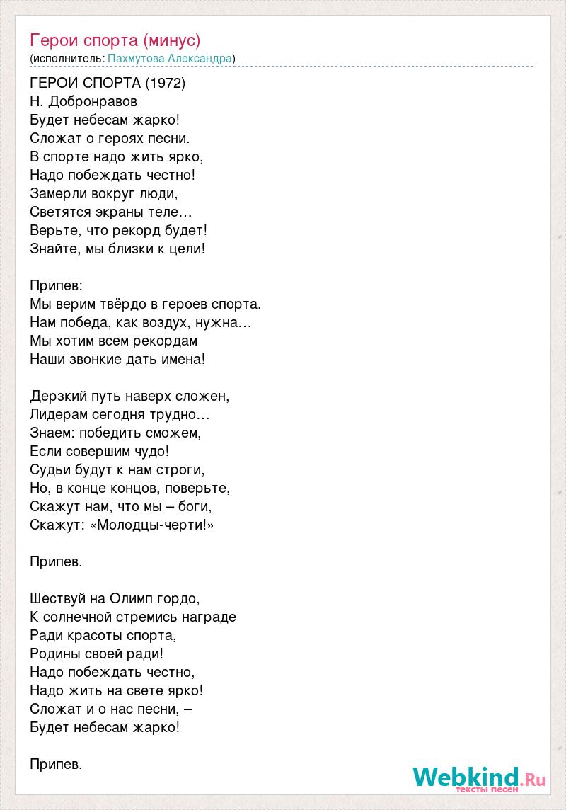 ГЕРОИ СПОРТА (1972) Н. Добронравов Будет небесам жарко! Сложат о героях песни. В спорте надо жить ярко, Надо побеждать честно! Замерли вокруг люди, Светятся экраны теле… Верьте, что рекорд будет! Знайте, мы близки к цели! Припев: Мы верим твёрдо в героев спорта. Нам победа, как воздух, нужна… Мы хотим всем рекордам Наши звонкие дать имена! Дерзкий путь наверх сложен, Лидерам сегодня трудно… Знаем: победить сможем, Если совершим чудо! Судьи будут к нам строги, Но, в конце концов, поверьте, Скажут нам, что мы – боги, Скажут: «Молодцы-черти!» Припев. Шествуй на Олимп гордо, К солнечной стремись награде Ради красоты спорта, Родины своей ради! Надо побеждать честно, Надо жить на свете ярко! Сложат и о нас песни, – Будет небесам жарко! Припев.