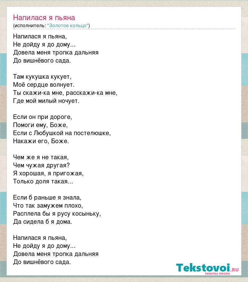 Напилася я пьяна, Не дойду я до дому... Довела меня тропка дальняя До вишнёвого сада. Там кукушка кукует, Моё сердце волнует. Ты скажи-ка мне, расскажи-ка мне, Где мой милый ночует. Если он при дороге, Помоги ему, Боже, Если с Любушкой на постелюшке, Накажи его, Боже. Чем же я не такая, Чем чужая другая? Я хорошая, я пригожая, Только доля такая... Если б раньше я знала, Что так замужем плохо, Расплела бы я русу косыньку, Да сидела б я дома. Напилася я пьяна, Не дойду я до дому... Довела меня тропка дальняя До вишнёвого сада.