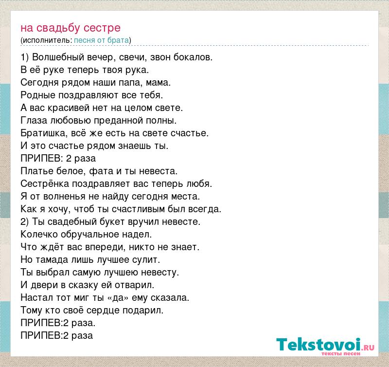 1) Волшебный вечер, свечи, звон бокалов. В её руке теперь твоя рука. Сегодня рядом наши папа, мама. Родные поздравляют все тебя. А вас красивей нет на целом свете. Глаза любовью преданной полны. Братишка, всё же есть на свете счастье. И это счастье рядом знаешь ты. ПРИПЕВ: 2 раза Платье белое, фата и ты невеста. Сестрёнка поздравляет вас теперь любя. Я от волненья не найду сегодня места. Как я хочу, чтоб ты счастливым был всегда. 2) Ты свадебный букет вручил невесте. Колечко обручальное надел. Что ждёт вас впереди, никто не знает. Но тамада лишь лучшее сулит. Ты выбрал самую лучшею невесту. И двери в сказку ей отварил. Настал тот миг ты «да» ему сказала. Тому кто своё сердце подарил. ПРИПЕВ:2 раза. ПРИПЕВ:2 раза