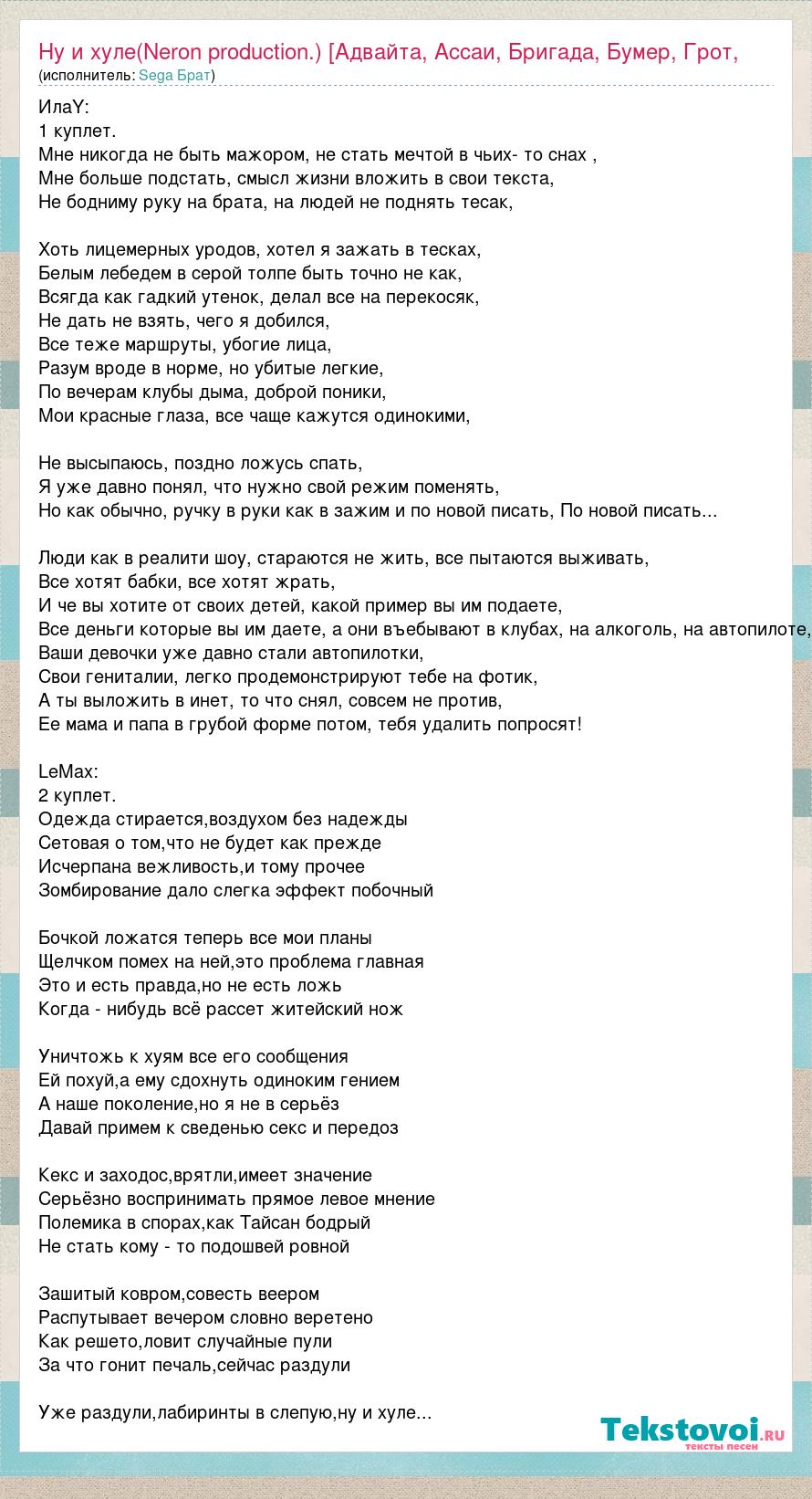 Главная→Исполнители→Sega Брат→Ну и хуле(Neron production.) [Адвайта, Ассаи, Бригада, Бумер, Грот, Ёлка, Жара,