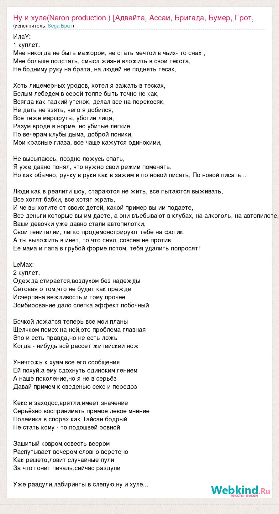 ИлаY: 1 куплет. Мне никогда не быть мажором, не стать мечтой в чьих- то снах , Мне больше подстать, смысл жизни вложить в свои текста, Не бодниму руку на брата, на людей не поднять тесак, Хоть лицемерных уродов, хотел я зажать в тесках, Белым лебедем в серой толпе быть точно не как, Всягда как гадкий утенок, делал все на перекосяк, Не дать не взять, чего я добился, Все теже маршруты, убогие лица, Разум вроде в норме, но убитые легкие, По вечерам клубы дыма, доброй поники, Мои красные глаза, все чаще кажутся одинокими, Не высыпаюсь, поздно ложусь спать, Я уже давно понял, что нужно свой режим поменять, Но как обычно, ручку в руки как в зажим и по новой писать, По новой писать... Люди как в реалити шоу, стараются не жить, все пытаются выживать, Все хотят бабки, все хотят жрать, И че вы хотите от своих детей, какой пример вы им подаете, Все деньги которые вы им даете, а они въебывают в клубах, на алкоголь, на автопилоте, Ваши девочки уже давно стали автопилотки, Свои гениталии, легко продемонстрируют тебе на фотик, А ты выложить в инет, то что снял, совсем не против, Ее мама и папа в грубой форме потом, тебя удалить попросят! LeMax: 2 куплет. Одежда стирается,воздухом без надежды Сетовая о том,что не будет как прежде Исчерпана вежливость,и тому прочее Зомбирование дало слегка эффект побочный Бочкой ложатся теперь все мои планы Щелчком помех на ней,это проблема главная Это и есть правда,но не есть ложь Когда - нибудь всё рассет житейский нож Уничтожь к хуям все его сообщения Ей похуй,а ему сдохнуть одиноким гением А наше поколение,но я не в серьёз Давай примем к сведенью секс и передоз Кекс и заходос,врятли,имеет значение Серьёзно воспринимать прямое левое мнение Полемика в спорах,как Тайсан бодрый Не стать кому - то подошвей ровной Зашитый ковром,совесть веером Распутывает вечером словно веретено Как решето,ловит случайные пули За что гонит печаль,сейчас раздули Уже раздули,лабиринты в слепую,ну и хуле...
