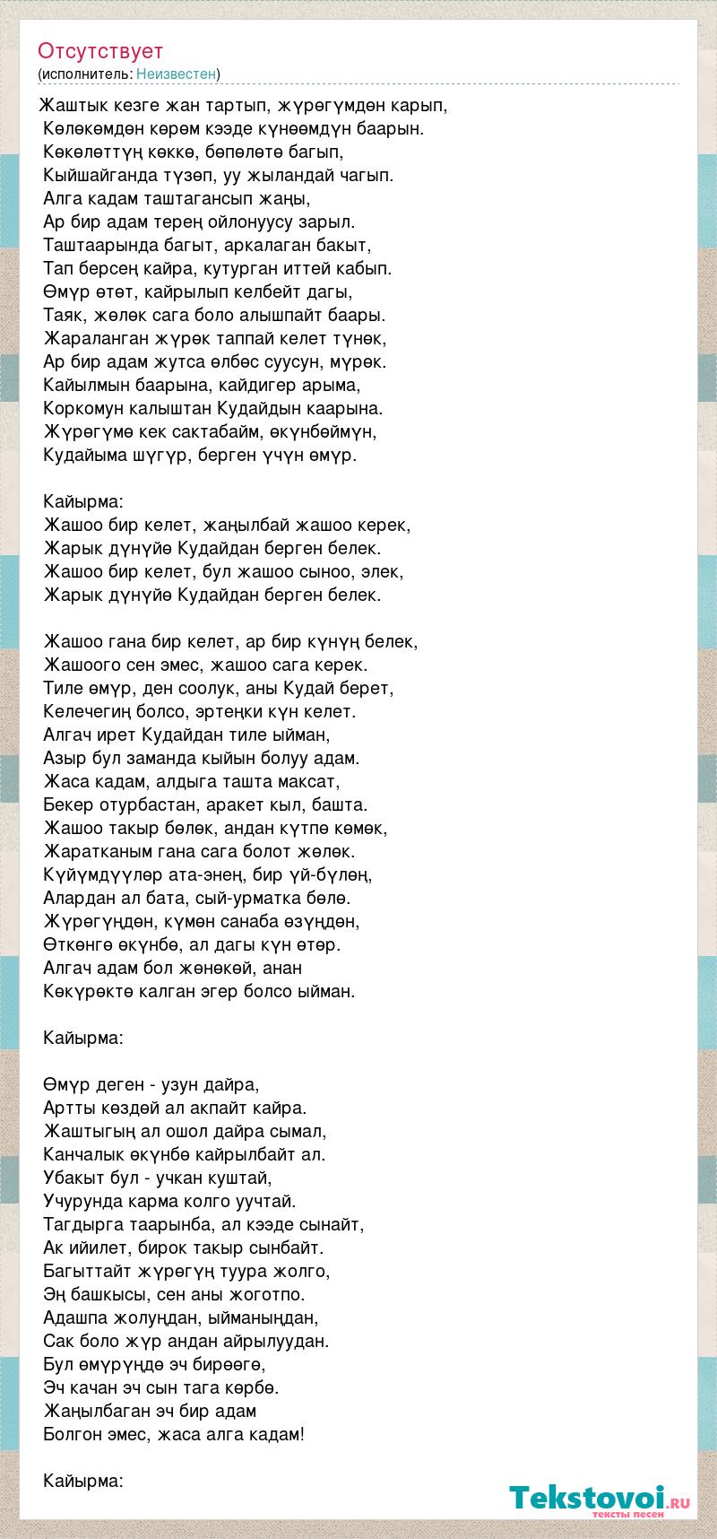 Жаштык кезге жан тартып, жүрөгүмдөн карып, Көлөкөмдөн көрөм кээде күнөөмдүн баарын. Көкөлөттүң көккө, бөпөлөтө багып, Кыйшайганда түзөп, уу жыландай чагып. Алга кадам таштагансып жаңы, Ар бир адам терең ойлонуусу зарыл. Таштаарында багыт, аркалаган бакыт, Тап берсең кайра, кутурган иттей кабып. Өмүр өтөт, кайрылып келбейт дагы, Таяк, жөлөк сага боло алышпайт баары. Жараланган жүрөк таппай келет түнөк, Ар бир адам жутса өлбөс суусун, мүрөк. Кайылмын баарына, кайдигер арыма, Коркомун калыштан Кудайдын каарына. Жүрөгүмө кек сактабайм, өкүнбөймүн, Кудайыма шүгүр, берген үчүн өмүр. Кайырма: Жашоо бир келет, жаңылбай жашоо керек, Жарык дүнүйө Кудайдан берген белек. Жашоо бир келет, бул жашоо сыноо, элек, Жарык дүнүйө Кудайдан берген белек. Жашоо гана бир келет, ар бир күнүң белек, Жашоого сен эмес, жашоо сага керек. Тиле өмүр, ден соолук, аны Кудай берет, Келечегиң болсо, эртеңки күн келет. Алгач ирет Кудайдан тиле ыйман, Азыр бул заманда кыйын болуу адам. Жаса кадам, алдыга ташта максат, Бекер отурбастан, аракет кыл, башта. Жашоо такыр бөлөк, андан күтпө көмөк, Жаратканым гана сага болот жөлөк. Күйүмдүүлөр ата-энең, бир үй-бүлөң, Алардан ал бата, сый-урматка бөлө. Жүрөгүңдөн, күмөн санаба өзүңдөн, Өткөнгө өкүнбө, ал дагы күн өтөр. Алгач адам бол жөнөкөй, анан Көкүрөктө калган эгер болсо ыйман. Кайырма: Өмүр деген - узун дайра, Артты көздөй ал акпайт кайра. Жаштыгың ал ошол дайра сымал, Канчалык өкүнбө кайрылбайт ал. Убакыт бул - учкан куштай, Учурунда карма колго уучтай. Тагдырга таарынба, ал кээде сынайт, Ак ийилет, бирок такыр сынбайт. Багыттайт жүрөгүң туура жолго, Эң башкысы, сен аны жоготпо. Адашпа жолуңдан, ыйманыңдан, Сак боло жүр андан айрылуудан. Бул өмүрүңдө эч бирөөгө, Эч качан эч сын тага көрбө. Жаңылбаган эч бир адам Болгон эмес, жаса алга кадам! Кайырма: