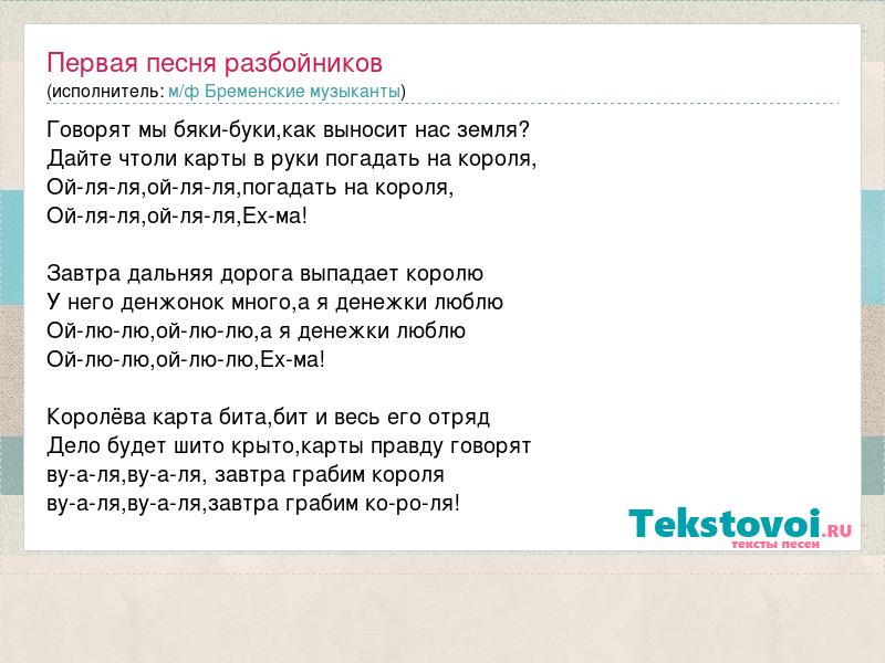 Говорят мы бяки-буки,как выносит нас земля? Дайте чтоли карты в руки погадать на короля, Ой-ля-ля,ой-ля-ля,погадать на короля, Ой-ля-ля,ой-ля-ля,Ех-ма! Завтра дальняя дорога выпадает королю У него денжонок много,а я денежки люблю Ой-лю-лю,ой-лю-лю,а я денежки люблю Ой-лю-лю,ой-лю-лю,Ех-ма! Королёва карта бита,бит и весь его отряд Дело будет шито крыто,карты правду говорят ву-а-ля,ву-а-ля, завтра грабим короля ву-а-ля,ву-а-ля,завтра грабим ко-ро-ля!