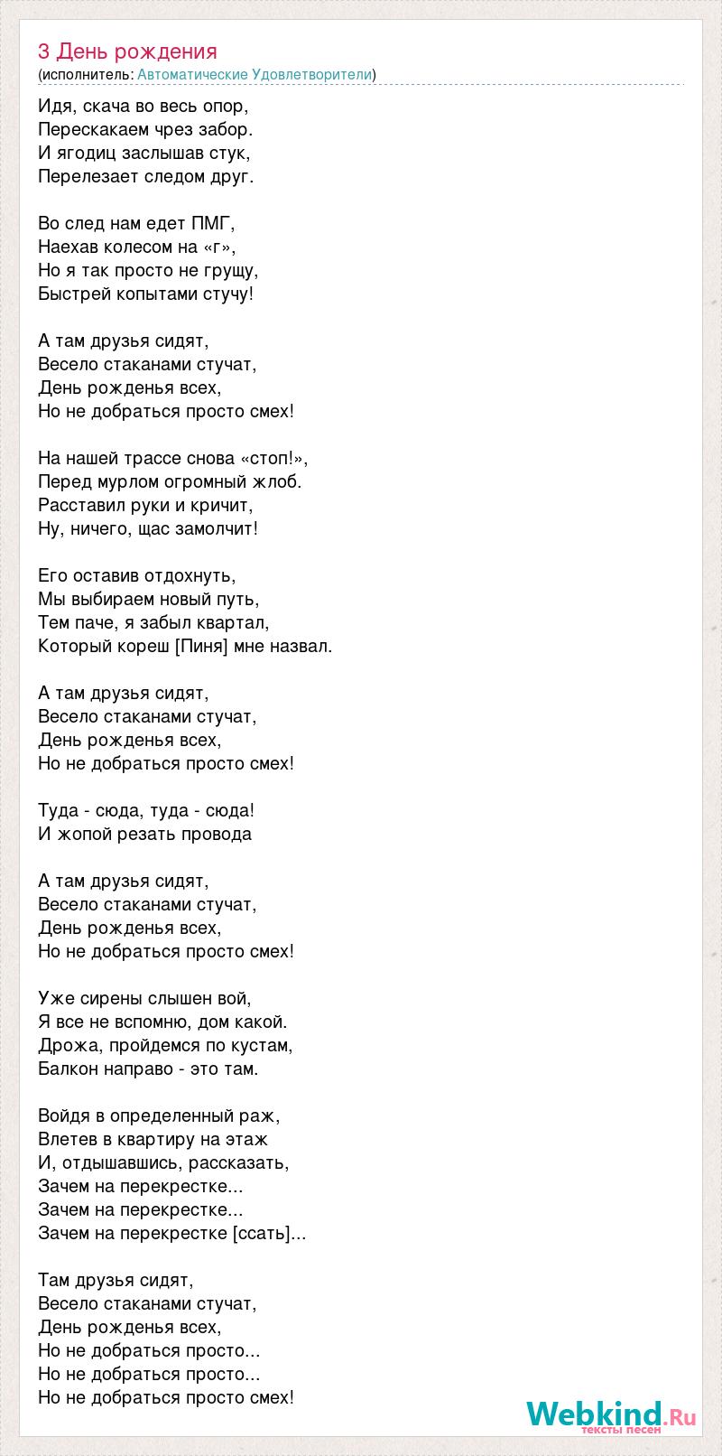 Идя, скача во весь опор, Перескакаем чрез забор. И ягодиц заслышав стук, Перелезает следом друг. Во след нам едет ПМГ, Наехав колесом на «г», Но я так просто не грущу, Быстрей копытами стучу! А там друзья сидят, Весело стаканами стучат, День рожденья всех, Но не добраться просто смех! На нашей трассе снова «стоп!», Перед мурлом огромный жлоб. Расставил руки и кричит, Ну, ничего, щас замолчит! Его оставив отдохнуть, Мы выбираем новый путь, Тем паче, я забыл квартал, Который кореш [Пиня] мне назвал. А там друзья сидят, Весело стаканами стучат, День рожденья всех, Но не добраться просто смех! Туда - сюда, туда - сюда! И жопой резать провода А там друзья сидят, Весело стаканами стучат, День рожденья всех, Но не добраться просто смех! Уже сирены слышен вой, Я все не вспомню, дом какой. Дрожа, пройдемся по кустам, Балкон направо - это там. Войдя в определенный раж, Влетев в квартиру на этаж И, отдышавшись, рассказать, Зачем на перекрестке... Зачем на перекрестке... Зачем на перекрестке [ссать]... Там друзья сидят, Весело стаканами стучат, День рожденья всех, Но не добраться просто... Но не добраться просто... Но не добраться просто смех!