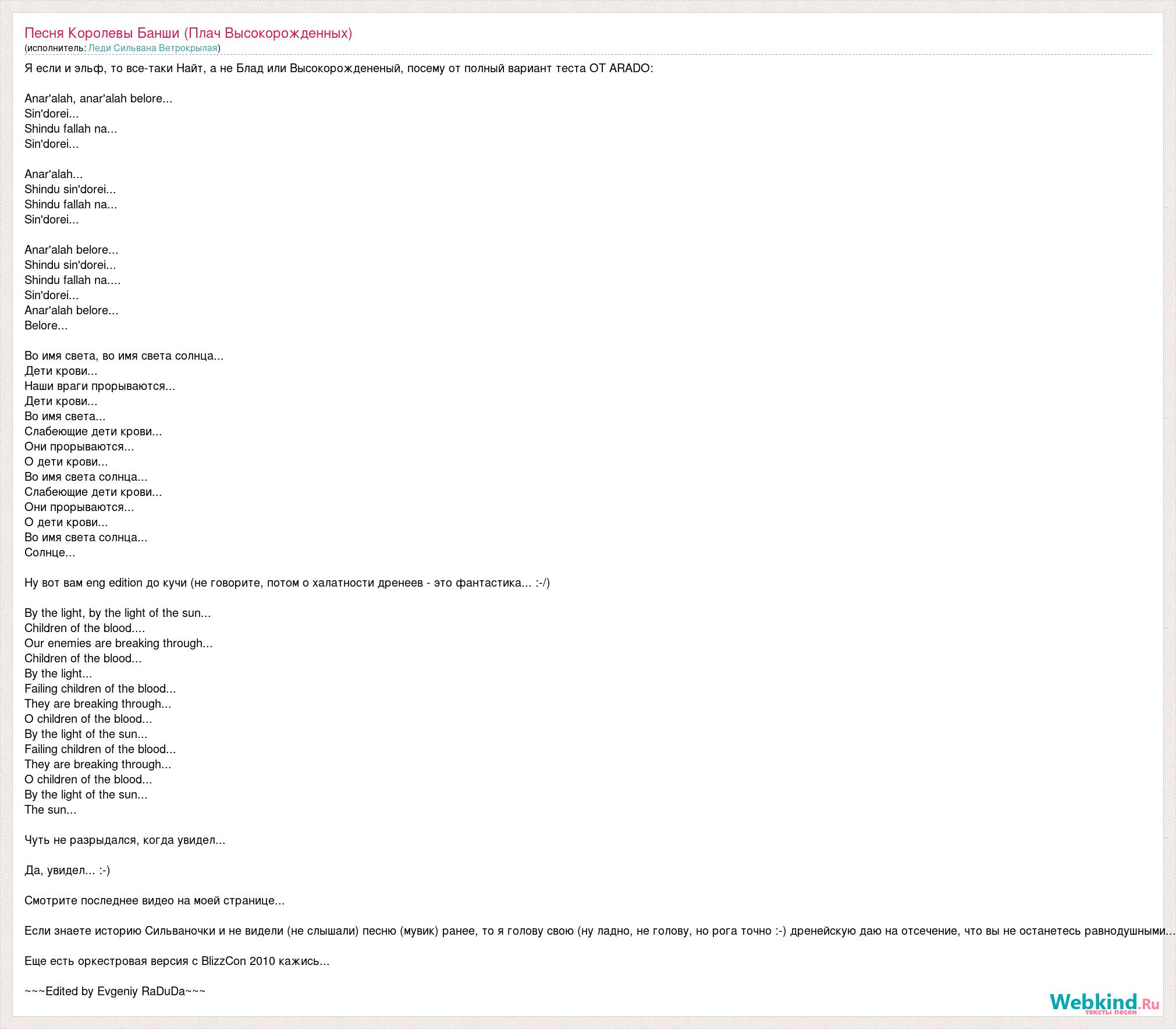 Я если и эльф, то все-таки Найт, а не Блад или Высокорождененый, посему от полный вариант теста ОТ ARADO: Anar'alah, anar'alah belore... Sin'dorei... Shindu fallah na... Sin'dorei... Anar'alah... Shindu sin'dorei... Shindu fallah na... Sin'dorei... Anar'alah belore... Shindu sin'dorei... Shindu fallah na.... Sin'dorei... Anar'alah belore... Belore... Во имя света, во имя света солнца... Дети крови... Наши враги прорываются... Дети крови... Во имя света... Слабеющие дети крови... Они прорываются... О дети крови... Во имя света солнца... Слабеющие дети крови... Они прорываются... О дети крови... Во имя света солнца... Солнце... Ну вот вам eng edition до кучи (не говорите, потом о халатности дренеев - это фантастика... :-/) By the light, by the light of the sun... Children of the blood.... Our enemies are breaking through... Children of the blood... By the light... Failing children of the blood... They are breaking through... O children of the blood... By the light of the sun... Failing children of the blood... They are breaking through... O children of the blood... By the light of the sun... The sun... Чуть не разрыдался, когда увидел... Да, увидел... :-) Смотрите последнее видео на моей странице... Если знаете историю Сильваночки и не видели (не слышали) песню (мувик) ранее, то я голову свою (ну ладно, не голову, но рога точно :-) дренейскую даю на отсечение, что вы не останетесь равнодушными... Еще есть оркестровая версия с BlizzCon 2010 кажись... ~~~Edited by Evgeniy RaDuDa~~~