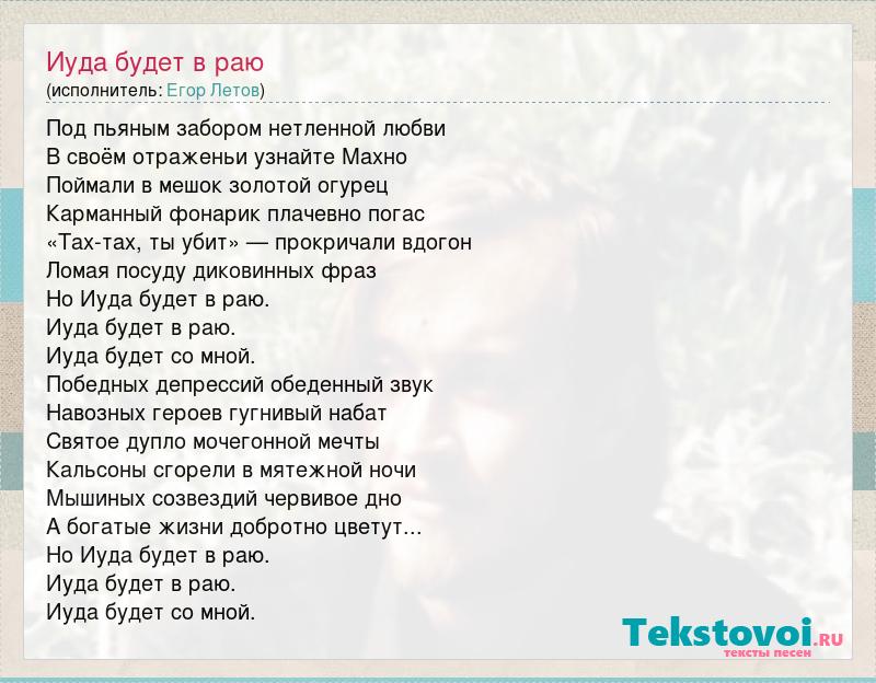 Под пьяным забором нетленной любви В своём отраженьи узнайте Махно Поймали в мешок золотой огурец Карманный фонарик плачевно погас «Тах-тах, ты убит» — прокричали вдогон Ломая посуду диковинных фраз Но Иуда будет в раю. Иуда будет в раю. Иуда будет со мной. Победных депрессий обеденный звук Навозных героев гугнивый набат Святое дупло мочегонной мечты Кальсоны сгорели в мятежной ночи Мышиных созвездий червивое дно А богатые жизни добротно цветут... Но Иуда будет в раю. Иуда будет в раю. Иуда будет со мной.