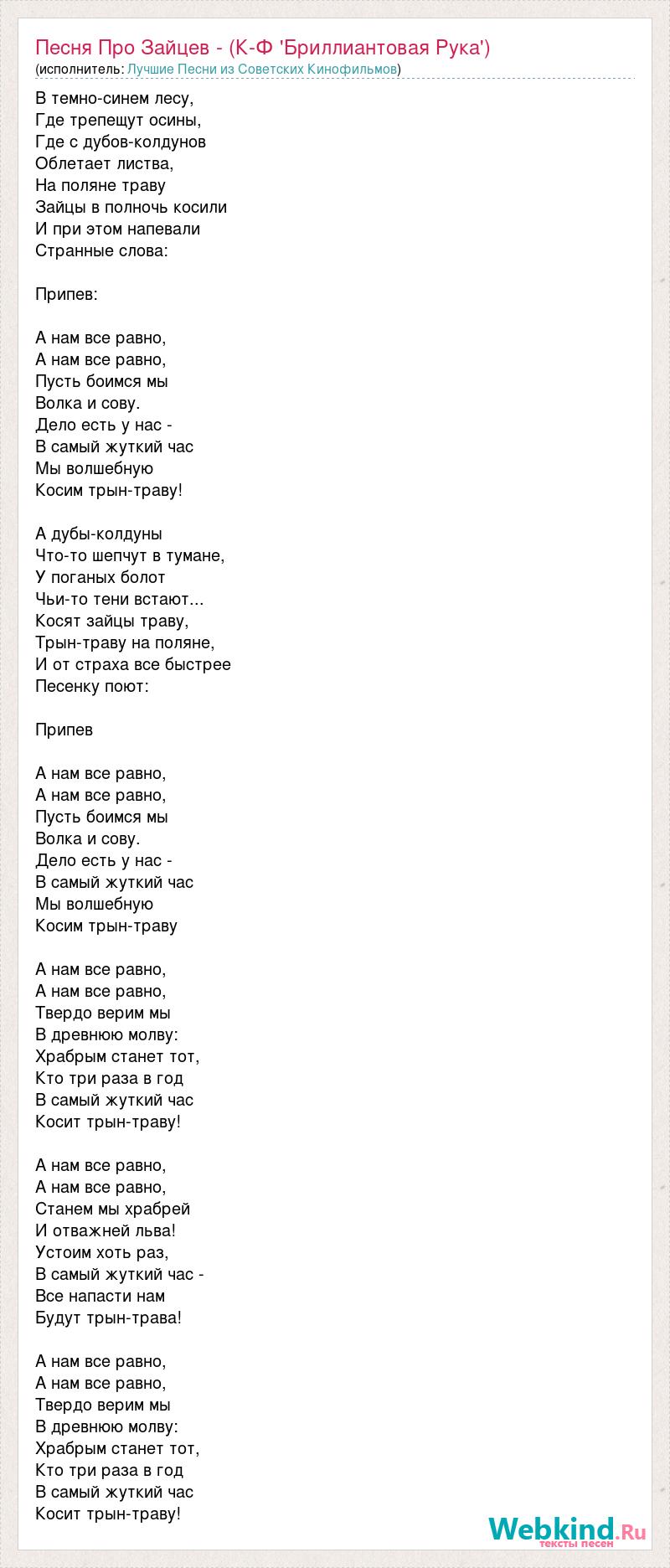В темно-синем лесу, Где трепещут осины, Где с дубов-колдунов Облетает листва, Hа поляне траву Зайцы в полночь косили И при этом напевали Странные слова: Припев: А нам все равно, А нам все равно, Пусть боимся мы Волка и сову. Дело есть у нас - В самый жуткий час Мы волшебную Косим трын-траву! А дубы-колдуны Что-то шепчут в тумане, У поганых болот Чьи-то тени встают... Косят зайцы траву, Трын-траву на поляне, И от страха все быстрее Песенку поют: Припев А нам все равно, А нам все равно, Пусть боимся мы Волка и сову. Дело есть у нас - В самый жуткий час Мы волшебную Косим трын-траву А нам все равно, А нам все равно, Твердо верим мы В древнюю молву: Храбрым станет тот, Кто три раза в год В самый жуткий час Косит трын-траву! А нам все равно, А нам все равно, Станем мы храбрей И отважней льва! Устоим хоть раз, В самый жуткий час - Все напасти нам Будут трын-трава! А нам все равно, А нам все равно, Твердо верим мы В древнюю молву: Храбрым станет тот, Кто три раза в год В самый жуткий час Косит трын-траву!