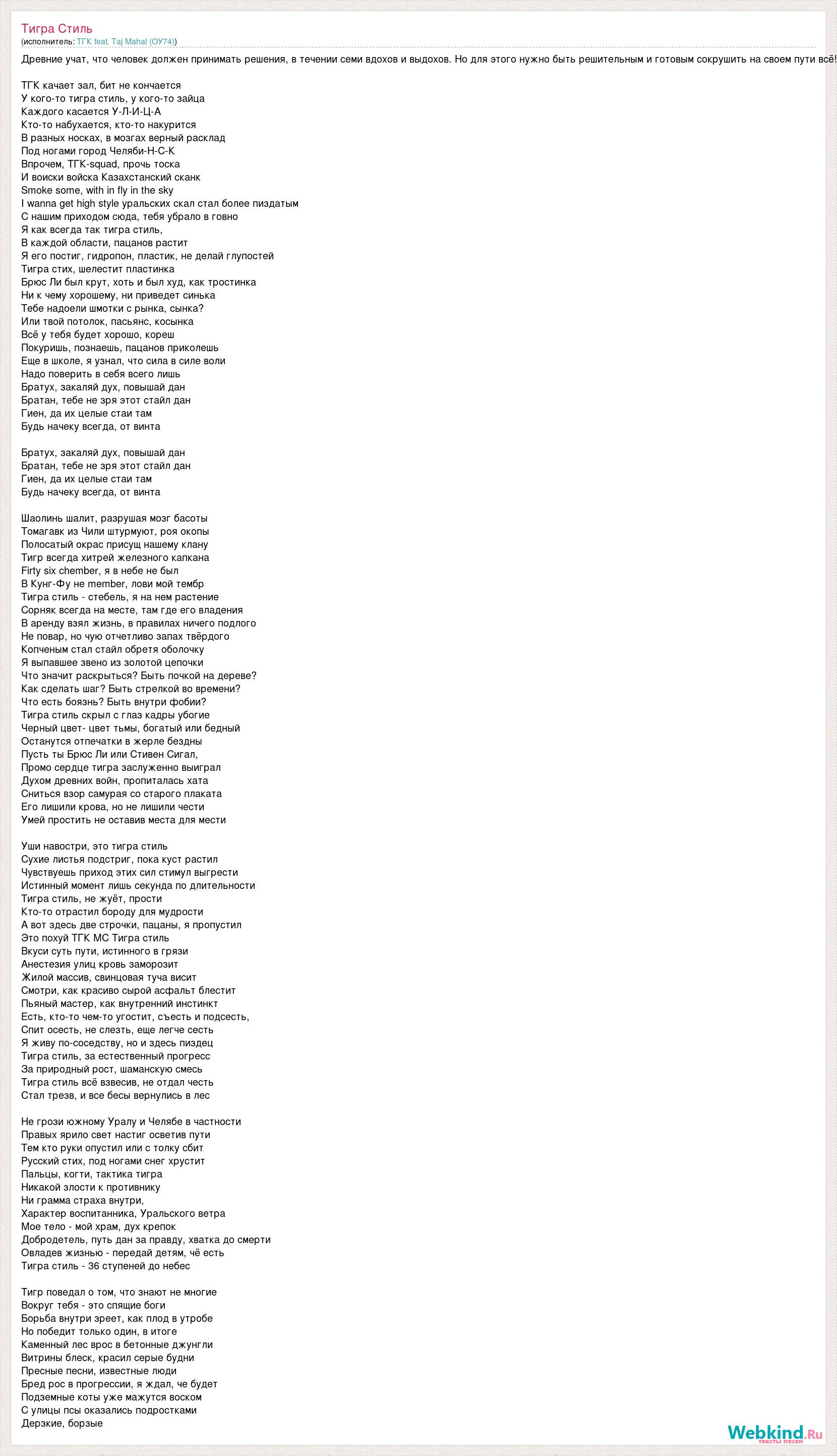 Древние учат, что человек должен принимать решения, в течении семи вдохов и выдохов. Но для этого нужно быть решительным и готовым сокрушить на своем пути всё! ТГК качает зал, бит не кончается У кого-то тигра стиль, у кого-то зайца Каждого касается У-Л-И-Ц-А Кто-то набухается, кто-то накурится В разных носках, в мозгах верный расклад Под ногами город Челяби-Н-С-К Впрочем, ТГК-squad, прочь тоска И воиски войска Казахстанский сканк Smoke some, with in fly in the sky I wanna get high style уральских скал стал более пиздатым С нашим приходом сюда, тебя убрало в говно Я как всегда так тигра стиль, В каждой области, пацанов растит Я его постиг, гидропон, пластик, не делай глупостей Тигра стих, шелестит пластинка Брюс Ли был крут, хоть и был худ, как тростинка Ни к чему хорошему, ни приведет синька Тебе надоели шмотки с рынка, сынка? Или твой потолок, пасьянс, косынка Всё у тебя будет хорошо, кореш Покуришь, познаешь, пацанов приколешь Еще в школе, я узнал, что сила в силе воли Надо поверить в себя всего лишь Братух, закаляй дух, повышай дан Братан, тебе не зря этот стайл дан Гиен, да их целые стаи там Будь начеку всегда, от винта Братух, закаляй дух, повышай дан Братан, тебе не зря этот стайл дан Гиен, да их целые стаи там Будь начеку всегда, от винта Шаолинь шалит, разрушая мозг басоты Томагавк из Чили штурмуют, роя окопы Полосатый окрас присущ нашему клану Тигр всегда хитрей железного капкана Firty six chember, я в небе не был В Кунг-Фу не member, лови мой тембр Тигра стиль - стебель, я на нем растение Сорняк всегда на месте, там где его владения В аренду взял жизнь, в правилах ничего подлого Не повар, но чую отчетливо запах твёрдого Копченым стал стайл обретя оболочку Я выпавшее звено из золотой цепочки Что значит раскрыться? Быть почкой на дереве? Как сделать шаг? Быть стрелкой во времени? Что есть боязнь? Быть внутри фобии? Тигра стиль скрыл с глаз кадры убогие Черный цвет- цвет тьмы, богатый или бедный Останутся отпечатки в жерле бездны Пусть ты Брюс Ли или Стивен Сигал, Промо сердце тигра заслуженно выиграл Духом древних войн, пропиталась хата Сниться взор самурая со старого плаката Его лишили крова, но не лишили чести Умей простить не оставив места для мести Уши навостри, это тигра стиль Сухие листья подстриг, пока куст растил Чувствуешь приход этих сил стимул выгрести Истинный момент лишь секунда по длительности Тигра стиль, не жуёт, прости Кто-то отрастил бороду для мудрости А вот здесь две строчки, пацаны, я пропустил Это похуй ТГК МС Тигра стиль Вкуси суть пути, истинного в грязи Анестезия улиц кровь заморозит Жилой массив, свинцовая туча висит Смотри, как красиво сырой асфальт блестит Пьяный мастер, как внутренний инстинкт Есть, кто-то чем-то угостит, съесть и подсесть, Спит осесть, не слезть, еще легче сесть Я живу по-соседству, но и здесь пиздец Тигра стиль, за естественный прогресс За природный рост, шаманскую смесь Тигра стиль всё взвесив, не отдал честь Стал трезв, и все бесы вернулись в лес Не грози южному Уралу и Челябе в частности Правых ярило свет настиг осветив пути Тем кто руки опустил или с толку сбит Русский стих, под ногами снег хрустит Пальцы, когти, тактика тигра Никакой злости к противнику Ни грамма страха внутри, Характер воспитанника, Уральского ветра Мое тело - мой храм, дух крепок Добродетель, путь дан за правду, хватка до смерти Овладев жизнью - передай детям, чё есть Тигра ст