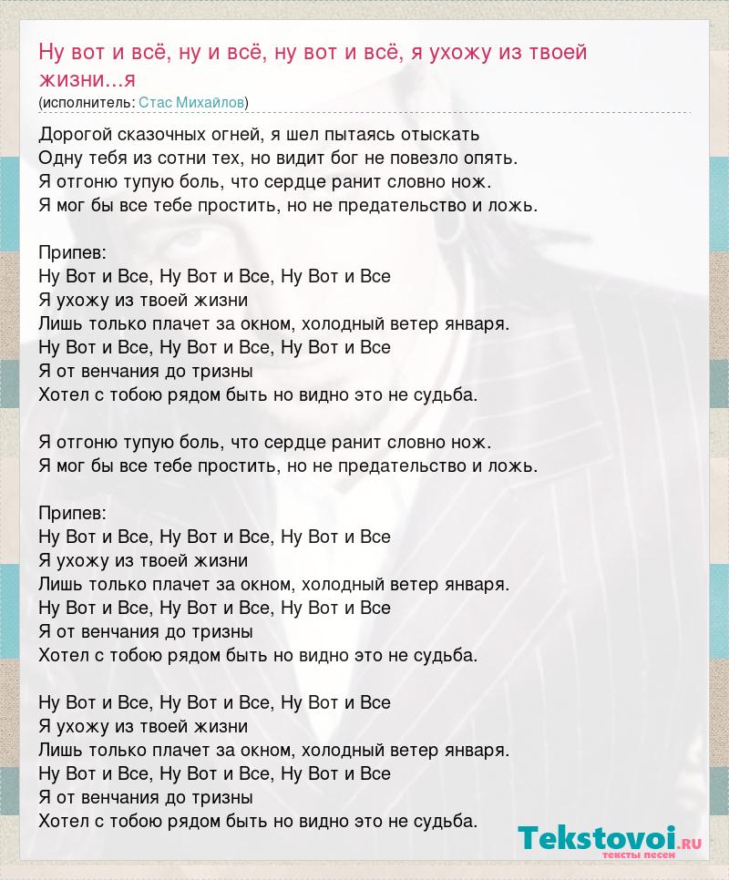 Дорогой сказочных огней, я шел пытаясь отыскать Одну тебя из сотни тех, но видит бог не повезло опять. Я отгоню тупую боль, что сердце ранит словно нож. Я мог бы все тебе простить, но не предательство и ложь. Припев: Ну Вот и Все, Ну Вот и Все, Ну Вот и Все Я ухожу из твоей жизни Лишь только плачет за окном, холодный ветер января. Ну Вот и Все, Ну Вот и Все, Ну Вот и Все Я от венчания до тризны Хотел с тобою рядом быть но видно это не судьба. Я отгоню тупую боль, что сердце ранит словно нож. Я мог бы все тебе простить, но не предательство и ложь. Припев: Ну Вот и Все, Ну Вот и Все, Ну Вот и Все Я ухожу из твоей жизни Лишь только плачет за окном, холодный ветер января. Ну Вот и Все, Ну Вот и Все, Ну Вот и Все Я от венчания до тризны Хотел с тобою рядом быть но видно это не судьба. Ну Вот и Все, Ну Вот и Все, Ну Вот и Все Я ухожу из твоей жизни Лишь только плачет за окном, холодный ветер января. Ну Вот и Все, Ну Вот и Все, Ну Вот и Все Я от венчания до тризны Хотел с тобою рядом быть но видно это не судьба.