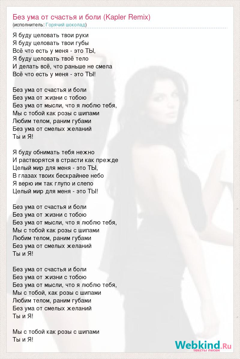 Я буду целовать твои руки Я буду целовать твои губы Всё что есть у меня - это ТЫ, Я буду целовать твоё тело И делать всё, что раньше не смела Всё что есть у меня - это ТЫ! Без ума от счастья и боли Без ума от жизни с тобою Без ума от мысли, что я люблю тебя, Мы с тобой как розы с шипами Любим телом, раним губами Без ума от смелых желаний Ты и Я! Я буду обнимать тебя нежно И растворятся в страсти как прежде Целый мир для меня - это ТЫ, В глазах твоих бескрайнее небо Я верю им так глупо и слепо Целый мир для меня - это ТЫ! Без ума от счастья и боли Без ума от жизни с тобою Без ума от мысли, что я люблю тебя, Мы с тобой как розы с шипами Любим телом, раним губами Без ума от смелых желаний Ты и Я! Без ума от счастья и боли Без ума от жизни с тобою Без ума от мысли, что я люблю тебя, Мы с тобой, как розы с шипами Любим телом, раним губами Без ума от смелых желаний Ты и Я! Мы с тобой как розы с шипами Ты и Я!