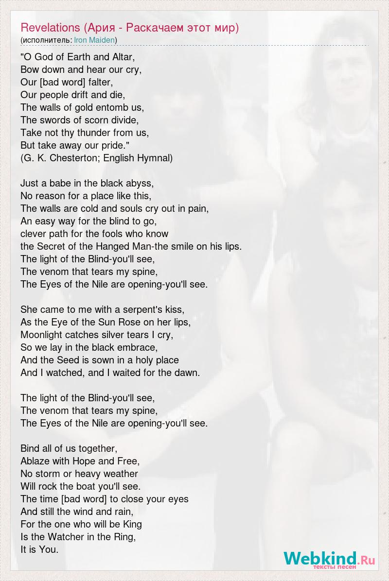 "O God of Earth and Altar, Bow down and hear our cry, Our [bad word] falter, Our people drift and die, The walls of gold entomb us, The swords of scorn divide, Take not thy thunder from us, But take away our pride." (G. K. Chesterton; English Hymnal) Just a babe in the black abyss, No reason for a place like this, The walls are cold and souls cry out in pain, An easy way for the blind to go, clever path for the fools who know the Secret of the Hanged Man-the smile on his lips. The light of the Blind-you'll see, The venom that tears my spine, The Eyes of the Nile are opening-you'll see. She came to me with a serpent's kiss, As the Eye of the Sun Rose on her lips, Moonlight catches silver tears I cry, So we lay in the black embrace, And the Seed is sown in a holy place And I watched, and I waited for the dawn. The light of the Blind-you'll see, The venom that tears my spine, The Eyes of the Nile are opening-you'll see. Bind all of us together, Ablaze with Hope and Free, No storm or heavy weather Will rock the boat you'll see. The time [bad word] to close your eyes And still the wind and rain, For the one who will be King Is the Watcher in the Ring, It is You.
