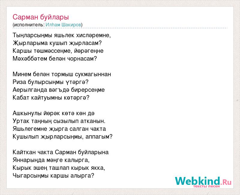 Тыңларсыңмы яшьлек хисләремне, Җырларыма кушып җырласам? Каршы төшмәссеңме, йөрәгеңне Мәхәббәтем белән чорнасам? Минем белән тормыш сукмагыннан Риза булырсыңмы үтәргә? Аерылганда вәгъдә бирерсеңме Кабат кайтуымны көтәргә? Ашкынулы йөрәк көтә көн дә Уртак таңның сызылып атканын. Яшьлегемне җырга салган чакта Кушылып җырларсыңмы, аппагым? Кайткан чакта Сарман буйларына Яннарыңда мәңге калырга, Кырык эшең ташлап кырык якка, Чыгарсыңмы каршы алырга?
