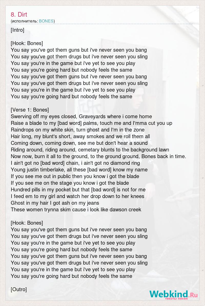 [Intro] [Hook: Bones] You say you've got them guns but i've never seen you bang You say you've got them drugs but i've never seen you sling You say you're in the game but i've yet to see you play You say you're going hard but nobody feels the same You say you've got them guns but i've never seen you bang You say you've got them drugs but i've never seen you sling You say you're in the game but i've yet to see you play You say you're going hard but nobody feels the same [Verse 1: Bones] Swerving off my eyes closed, Graveyards where i come home Raise a blade to my [bad word] palms, touch me and I'mma cut you up Raindrops on my white skin, turn ghost and I'm in the zone Hair long, my blunt's short, away smokes and we roll them all Coming down, coming down, see me but don't hear a sound Riding around, riding around, cemetary blunts to the background lawn Now now, burn it all to the ground, to the ground ground, Bones back in time. I ain't got no [bad word] chain, i ain't got no diamond ring Young justin timberlake, all these [bad word] know my name If you see me out in public then you know i got the blade If you see me on the stage you know i got the blade Hundred pills in my pocket but that [bad word] is not for me I feed em to my girl and watch her drop down to her knees Ghost in my hair I got ash on my jeans These women trynna skim cause i look like dawson creek [Hook: Bones] You say you've got them guns but i've never seen you bang You say you've got them drugs but i've never seen you sling You say you're in the game but i've yet to see you play You say you're going hard but nobody feels the same You say you've got them guns but i've never seen you bang You say you've got them drugs but i've never seen you sling You say you're in the game but i've yet to see you play You say you're going hard but nobody feels the same [Outro]