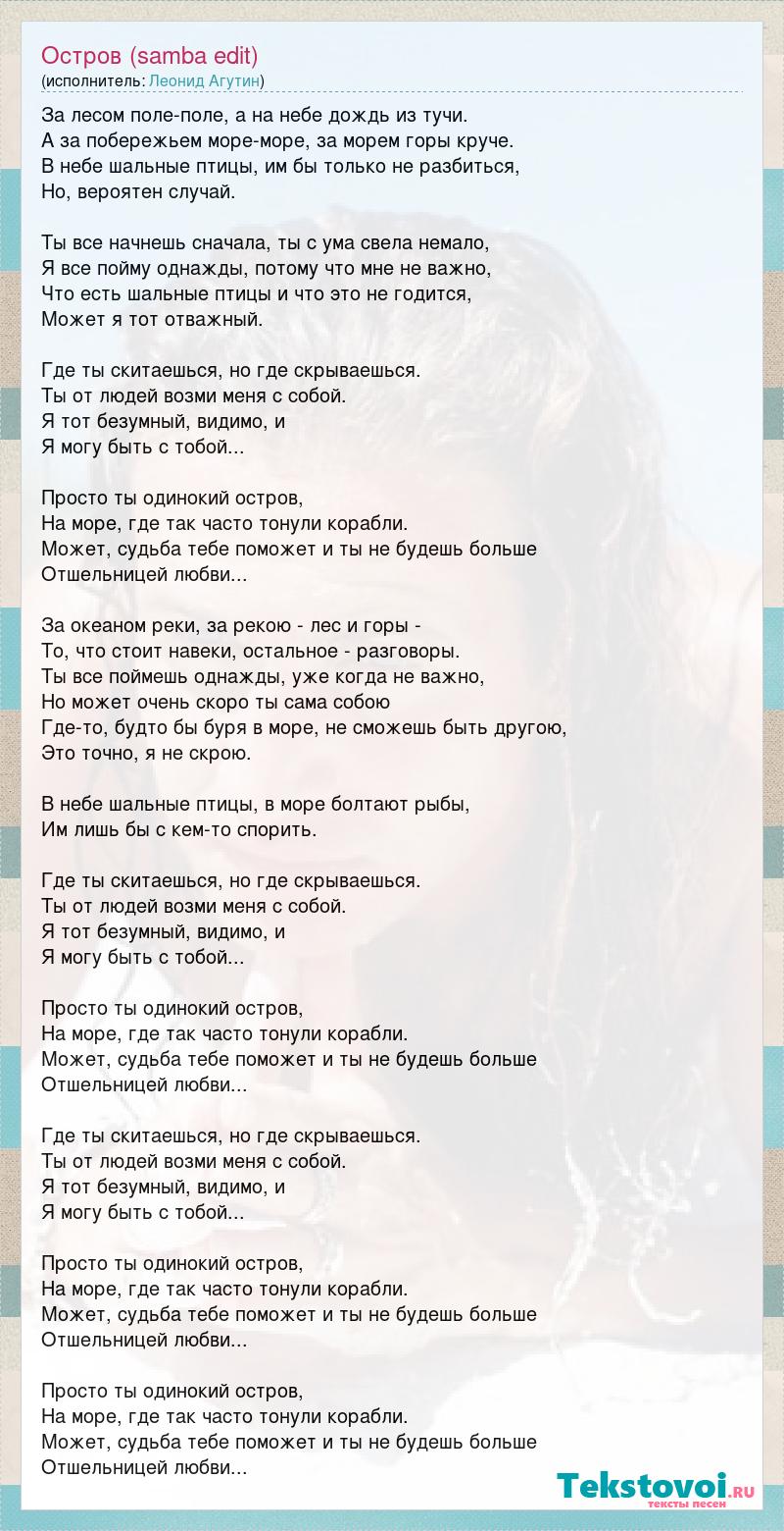 За лесом поле-поле, а на небе дождь из тучи. А за побережьем море-море, за морем горы круче. В небе шальные птицы, им бы только не разбиться, Но, вероятен случай. Ты все начнешь сначала, ты с ума свела немало, Я все пойму однажды, потому что мне не важно, Что есть шальные птицы и что это не годится, Может я тот отважный. Где ты скитаешься, но где скрываешься. Ты от людей возми меня с собой. Я тот безумный, видимо, и Я могу быть с тобой... Просто ты одинокий остров, На море, где так часто тонули корабли. Может, судьба тебе поможет и ты не будешь больше Отшельницей любви... За океаном реки, за рекою - лес и горы - То, что стоит навеки, остальное - разговоры. Ты все поймешь однажды, уже когда не важно, Но может очень скоро ты сама собою Где-то, будто бы буря в море, не сможешь быть другою, Это точно, я не скрою. В небе шальные птицы, в море болтают рыбы, Им лишь бы с кем-то спорить. Где ты скитаешься, но где скрываешься. Ты от людей возми меня с собой. Я тот безумный, видимо, и Я могу быть с тобой... Просто ты одинокий остров, На море, где так часто тонули корабли. Может, судьба тебе поможет и ты не будешь больше Отшельницей любви... Где ты скитаешься, но где скрываешься. Ты от людей возми меня с собой. Я тот безумный, видимо, и Я могу быть с тобой... Просто ты одинокий остров, На море, где так часто тонули корабли. Может, судьба тебе поможет и ты не будешь больше Отшельницей любви... Просто ты одинокий остров, На море, где так часто тонули корабли. Может, судьба тебе поможет и ты не будешь больше Отшельницей любви...