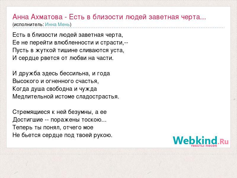 А как ты думаешь, о чем песня "Анна Ахматова - Есть в близости людей заветная черта..." ?