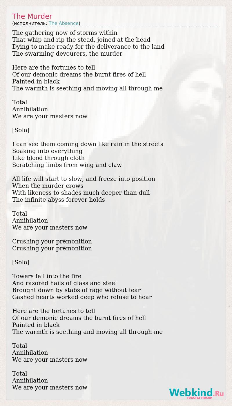 The gathering now of storms within That whip and rip the stead, joined at the head Dying to make ready for the deliverance to the land The swarming devourers, the murder Here are the fortunes to tell Of our demonic dreams the burnt fires of hell Painted in black The warmth is seething and moving all through me Total Annihilation We are your masters now [Solo] I can see them coming down like rain in the streets Soaking into everything Like blood through cloth Scratching limbs from wing and claw All life will start to slow, and freeze into position When the murder crows With likeness to shades much deeper than dull The infinite abyss forever holds Total Annihilation We are your masters now Crushing your premonition Crushing your premonition [Solo] Towers fall into the fire And razored hails of glass and steel Brought down by stabs of rage without fear Gashed hearts worked deep who refuse to hear Here are the fortunes to tell Of our demonic dreams the burnt fires of hell Painted in black The warmth is seething and moving all through me Total Annihilation We are your masters now Total Annihilation We are your masters now