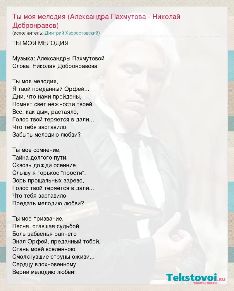 ТЫ МОЯ МЕЛОДИЯ Музыка: Александры Пахмутовой Слова: Николая Добронравова Ты моя мелодия, Я твой преданный Орфей... Дни, что нами пройдены, Помнят свет нежности твоей. Все, как дым, растаяло, Голос твой теряется в дали... Что тебя заставило Забыть мелодию любви? Ты мое сомнение, Тайна долгого пути. Сквозь дожди осенние Слышу я горькое "прости". Зорь прощальных зарево, Голос твой теряется в дали... Что тебя заставило Предать мелодию любви? Ты мое призвание, Песня, ставшая судьбой, Боль забвенья раннего Знал Орфей, преданный тобой. Стань моей вселенною, Смолкнувшие струны оживи... Сердцу вдохновенному Верни мелодию любви!