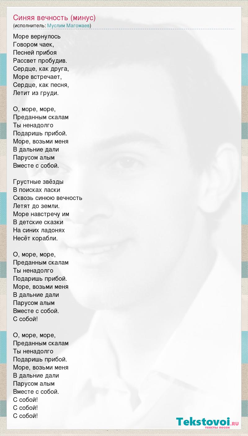 Море вернулось Говором чаек, Песней прибоя Рассвет пробудив. Сердце, как друга, Море встречает, Сердце, как песня, Летит из груди. О, море, море, Преданным скалам Ты ненадолго Подаришь прибой. Море, возьми меня В дальние дали Парусом алым Вместе с собой. Грустные звёзды В поисках ласки Сквозь синюю вечность Летят до земли. Море навстречу им В детские сказки На синих ладонях Несёт корабли. О, море, море, Преданным скалам Ты ненадолго Подаришь прибой. Море, возьми меня В дальние дали Парусом алым Вместе с собой. С собой! О, море, море, Преданным скалам Ты ненадолго Подаришь прибой. Море, возьми меня В дальние дали Парусом алым Вместе с собой. С собой! С собой! С собой!