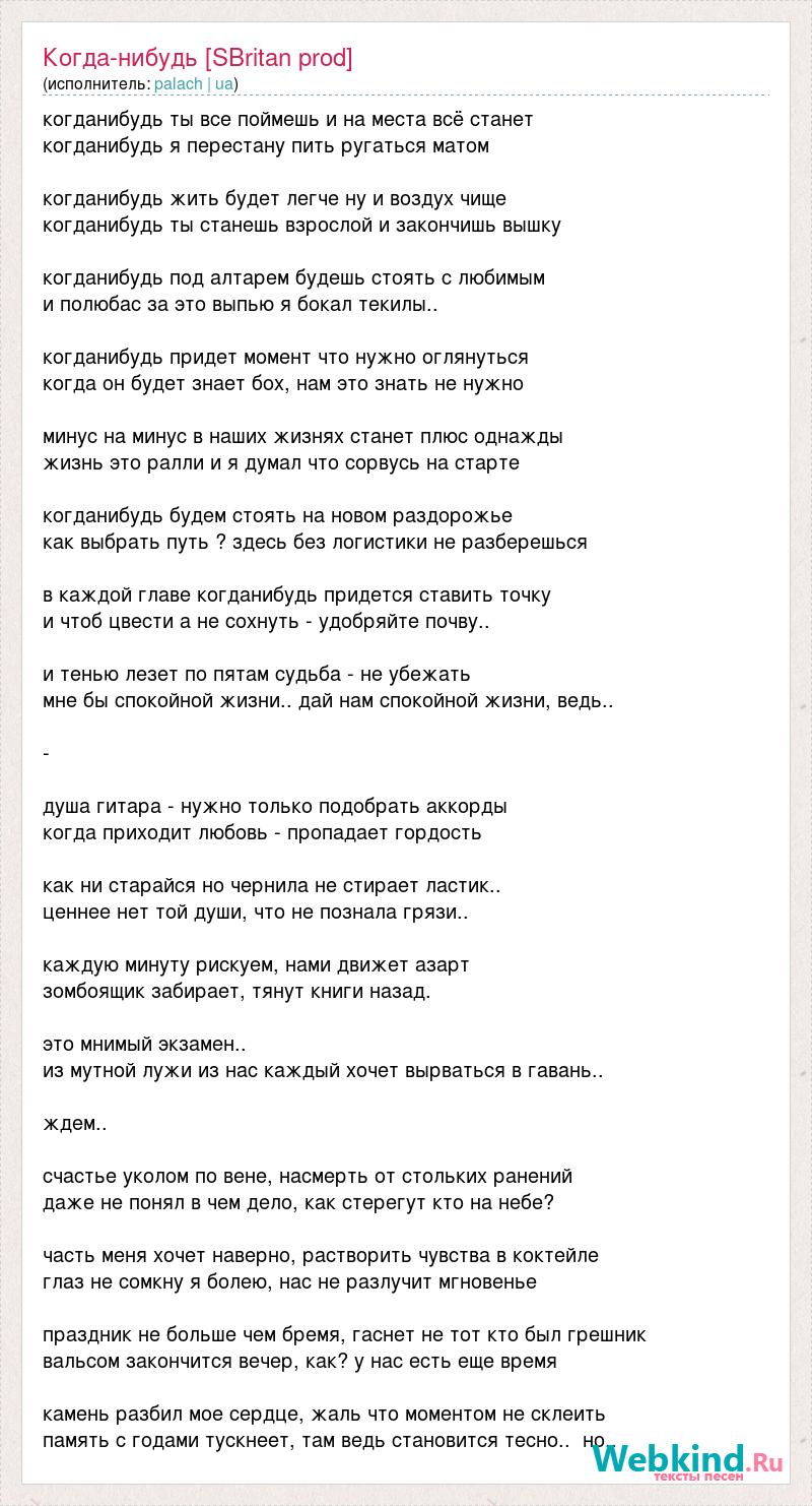когданибудь ты все поймешь и на места всё станет когданибудь я перестану пить ругаться матом когданибудь жить будет легче ну и воздух чище когданибудь ты станешь взрослой и закончишь вышку когданибудь под алтарем будешь стоять с любимым и полюбас за это выпью я бокал текилы.. когданибудь придет момент что нужно оглянуться когда он будет знает бох, нам это знать не нужно минус на минус в наших жизнях станет плюс однажды жизнь это ралли и я думал что сорвусь на старте когданибудь будем стоять на новом раздорожье как выбрать путь ? здесь без логистики не разберешься в каждой главе когданибудь придется ставить точку и чтоб цвести а не сохнуть - удобряйте почву.. и тенью лезет по пятам судьба - не убежать мне бы спокойной жизни.. дай нам спокойной жизни, ведь.. - душа гитара - нужно только подобрать аккорды когда приходит любовь - пропадает гордость как ни старайся но чернила не стирает ластик.. ценнее нет той души, что не познала грязи.. каждую минуту рискуем, нами движет азарт зомбоящик забирает, тянут книги назад. это мнимый экзамен.. из мутной лужи из нас каждый хочет вырваться в гавань.. ждем.. счастье уколом по вене, насмерть от стольких ранений даже не понял в чем дело, как стерегут кто на небе? часть меня хочет наверно, растворить чувства в коктейле глаз не сомкну я болею, нас не разлучит мгновенье праздник не больше чем бремя, гаснет не тот кто был грешник вальсом закончится вечер, как? у нас есть еще время камень разбил мое сердце, жаль что моментом не склеить память с годами тускнеет, там ведь становится тесно.. но..